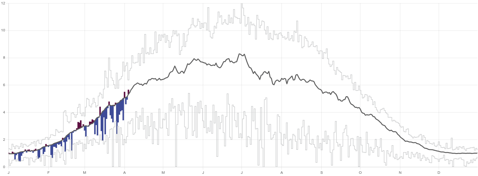 Besonders die erste Monatsdekade zeichnete sich für den deutlich zu milden März verantwortlich, am 6. März wurde mit 24,1 Grad in Bad Vöslau der Höchstwert gemessen. Ein Sommertag (25 Grad oder mehr) wurde zwar nur knapp verpasst, nichtsdestotrotz war der Märzauftakt außergewöhnlich. Ganze sechs Mal in Folge wurde Anfang des Monats die 20-Grad-Marke überschritten, es war dies die längste Serie an warmen Tagen so früh im Jahr. Die gut 24 Grad haben auch den Österreichrekord für die erste Märzdekade nur denkbar knapp verfehlt (dieser liegt weiterhin bei 24,3 Grad).