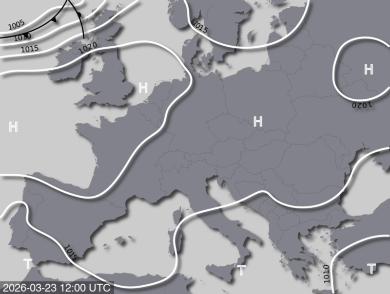 Bodendruck- und Frontenkarte für Donnerstag, 05. März 2026, 13:00 MEZ (Quelle: UBIMET)