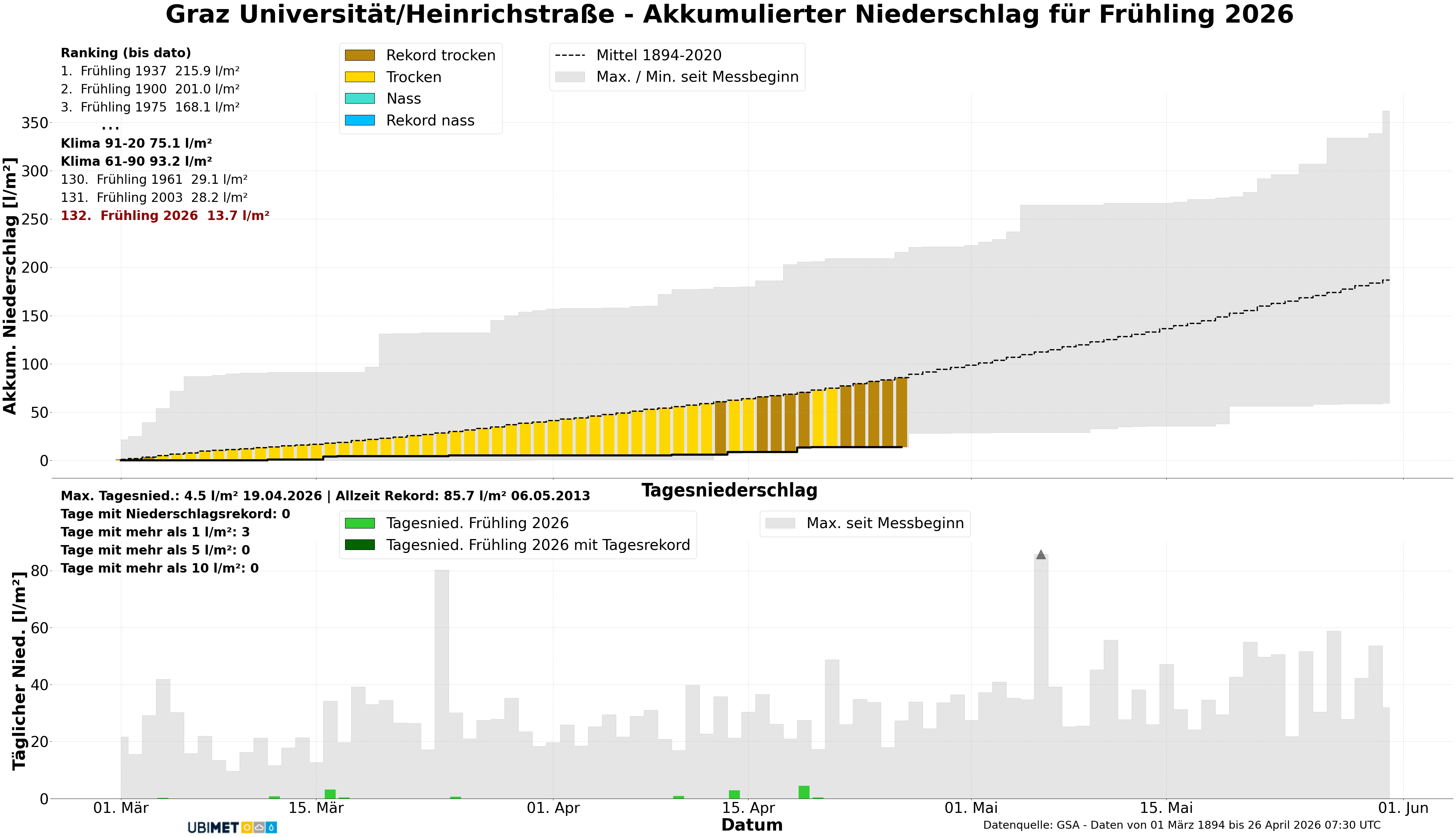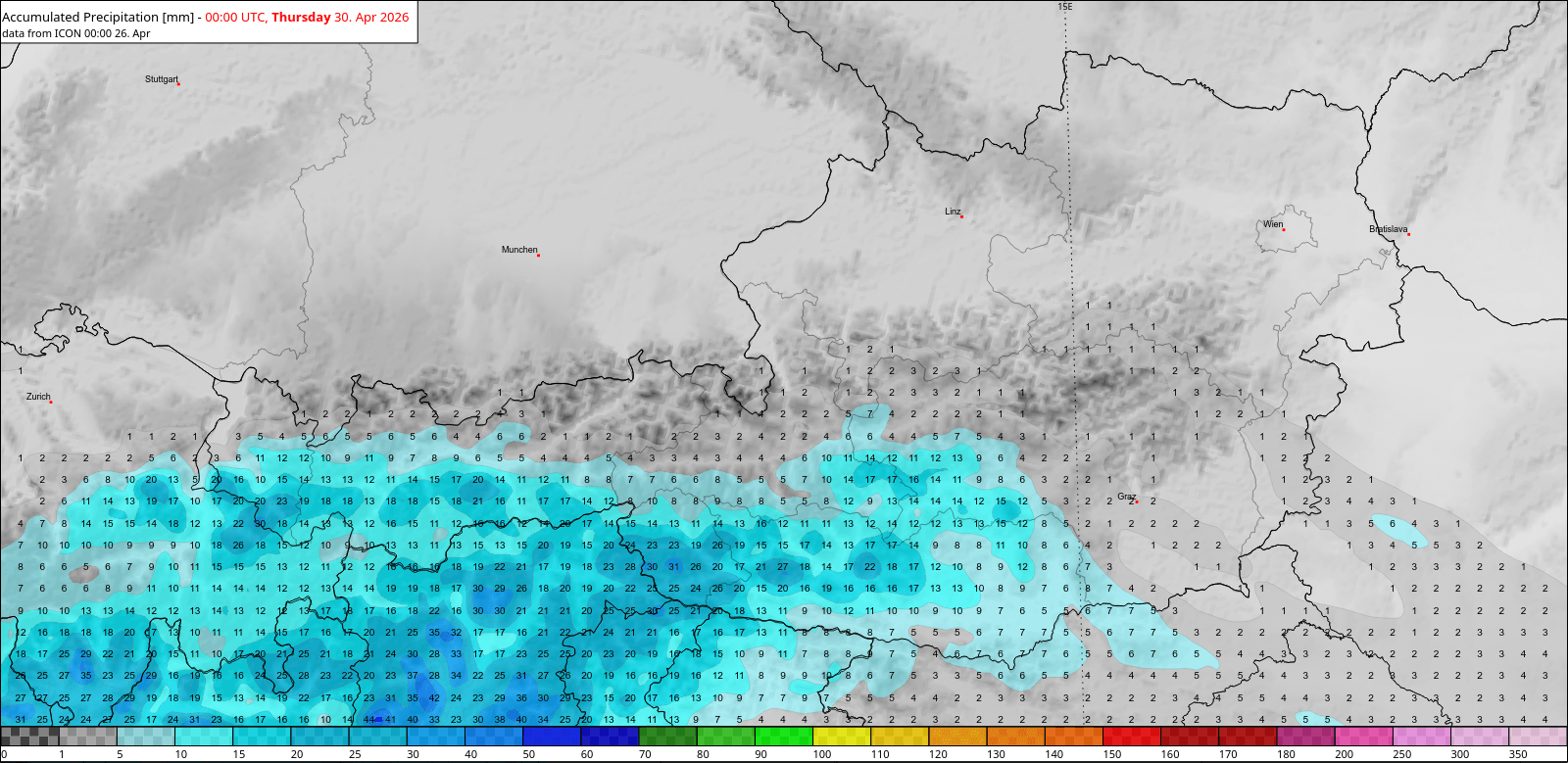 Den bislang frühesten Sommertag mit 25,3 Grad gab es hierzulande übrigens am 18.03.2004 in Pottschach-Ternitz (NÖ), den frühesten Hitzetag mit 30,0 Grad hingegen am 7.4.2024 in Bruck an der Mur (ST).