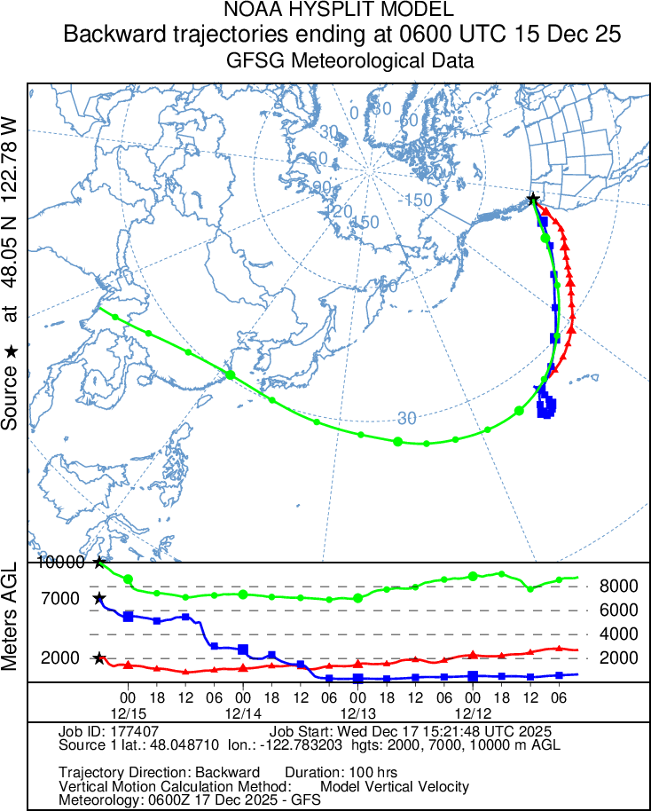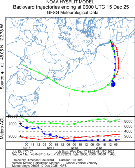 Betrachtet man die Herkunft der Luftmasse ( grün, blau, rote Linien), zeigt sich, dass sie aus dem Pazifikraum rund um Hawaii stammt. Aufgrund dieses Ursprungs wird ein solcher atmosphärischer Fluss in den USA häufig als „Pineapple Express“ bezeichnet.