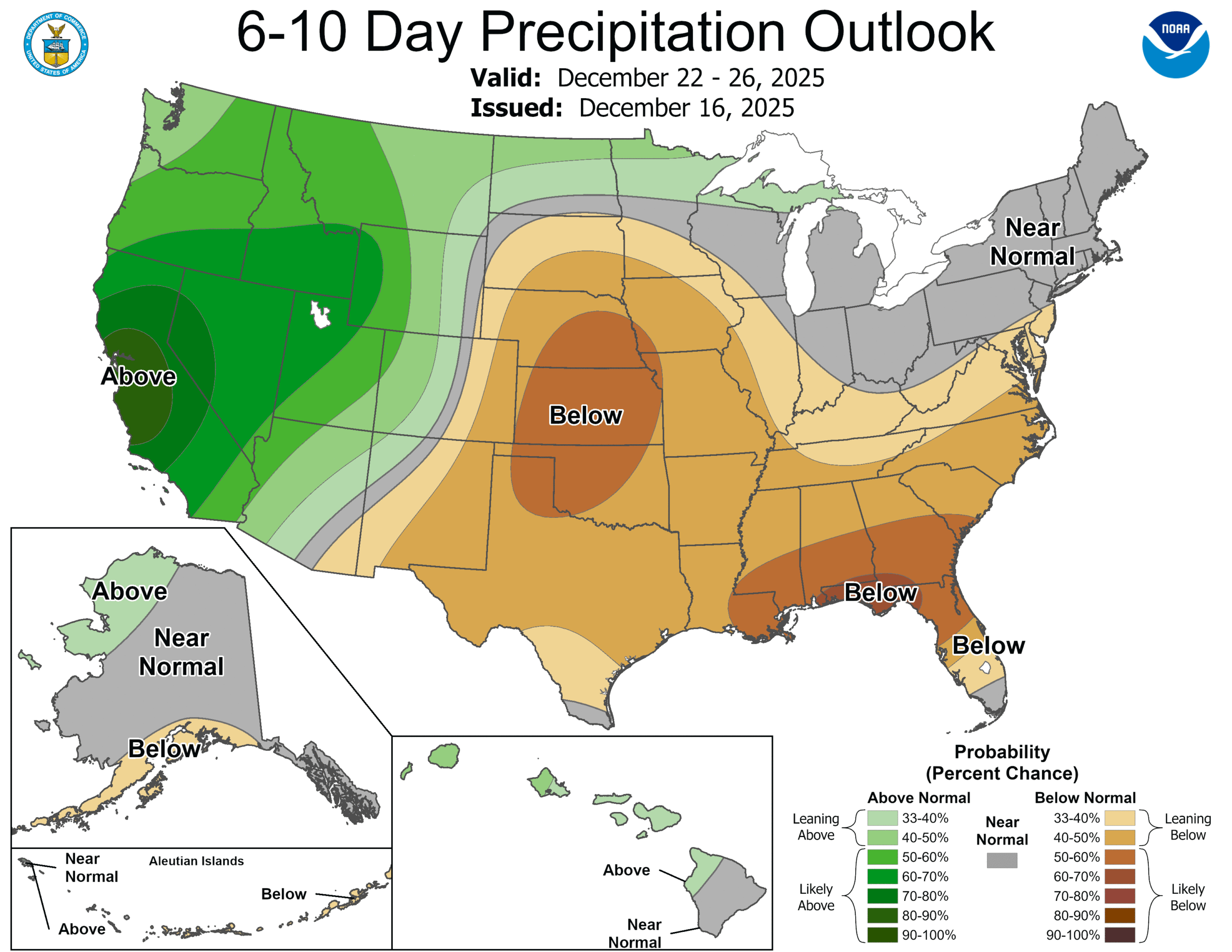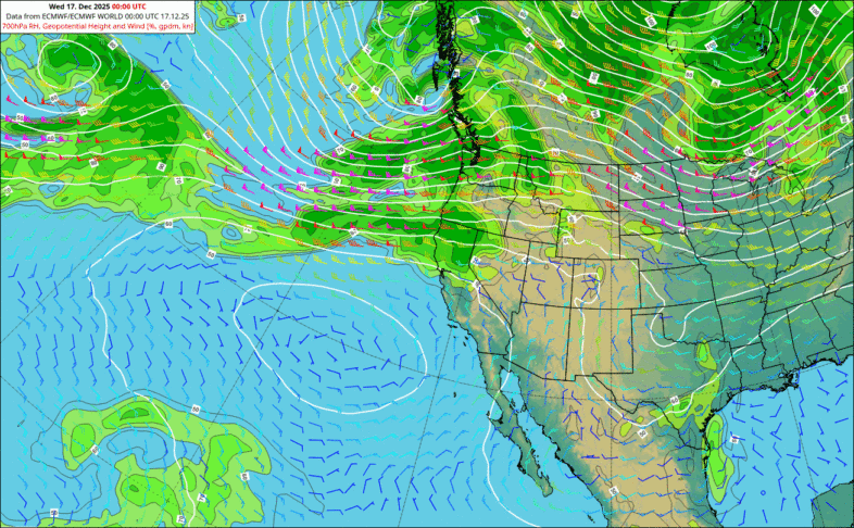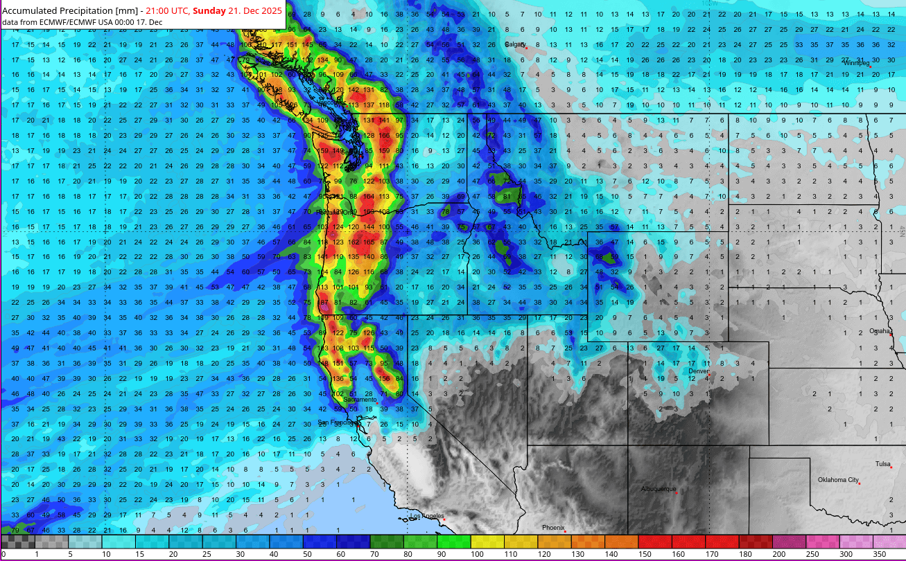 Auch die mittelfristigen Prognosen zeigen ein erhöhtes Signal für eine anhaltend nasse Wetterlage. Der Schwerpunkt der Niederschläge verlagert sich dabei voraussichtlich weiter nach Süden, mit zunehmendem Einfluss bis in Teile Kaliforniens.