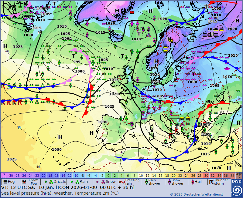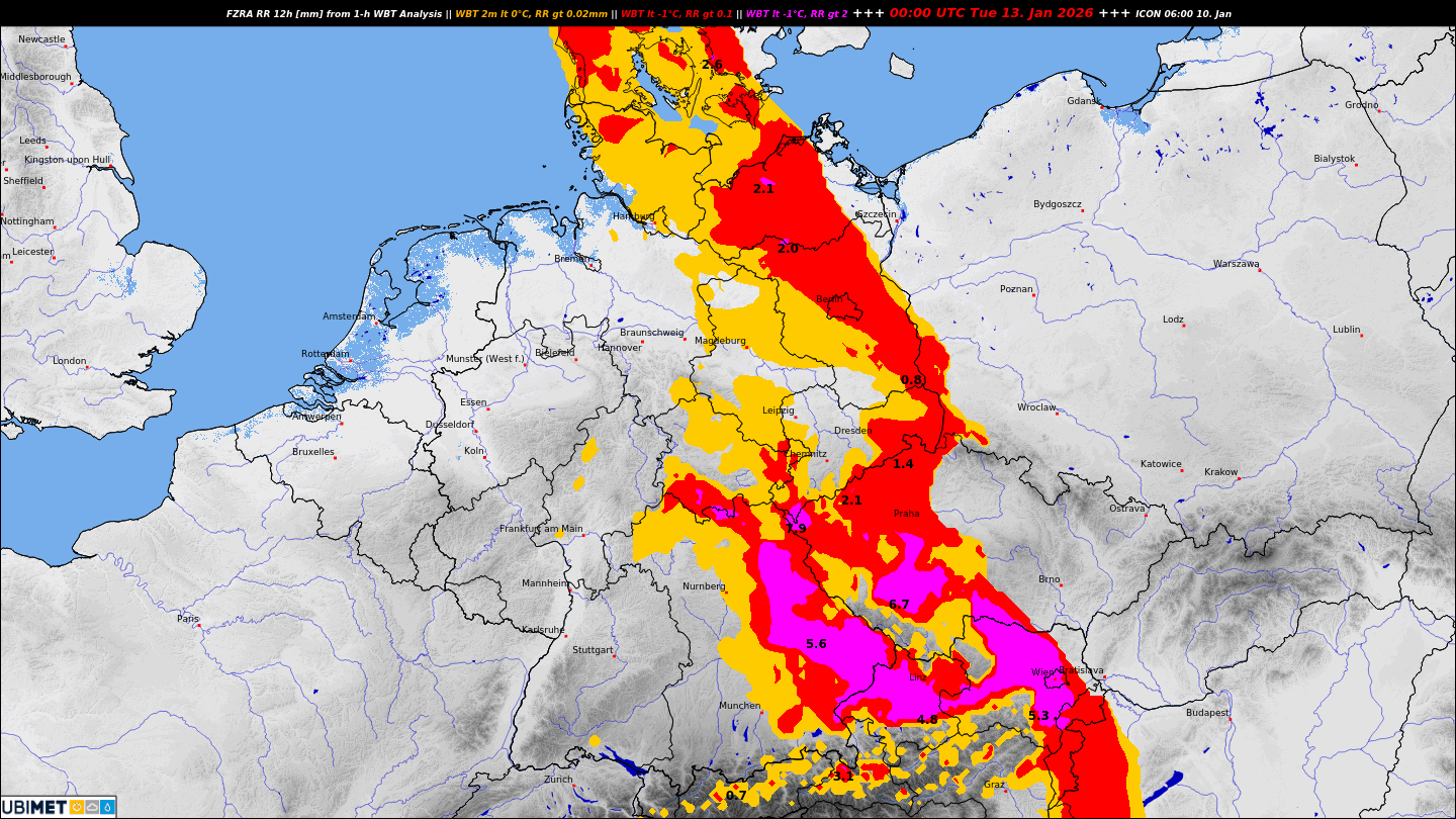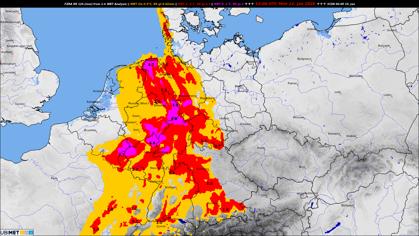 Prognostiziert wird mit Durchzug der Warmfront über die zuvor noch sehr frostige Luft am Boden verbreitet in Deutschland markanter gefrierender Regen (mit den Warnfarben orange, rot und violett):