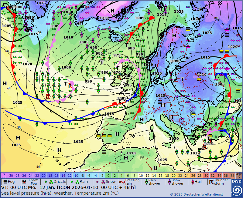 Entsprechend wird dieser Luftmassenwechsel auch in der Frontenkarte für die Nacht auf Montag deutlich. Gut auszumachen hier das Tief über den Britischen Inseln und dessen Warmfront bereits westlich von Deutschland: