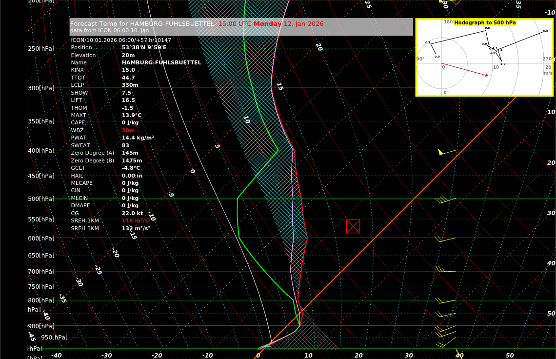 Als Beispiel dient hier Hamburg. Die orangene Linie ist sozusagen die 0-Grad Kennlinie von unten – Erdboden bis in höhere Luftschichten mit rechts davon Plusgraden und links davon Minusgraden. Die rote Kurve stellt den Temperaturverlauf der Luftschichten über Hamburg am Montag um 16 Uhr dar. Man erkennt im unteren Bereich des Diagramms diese Ausbeulung der roten Kurve in den Temperaturbereich rechts der orangenen Linie mit Plusgraden. In diesen Luftschichten taut der fallende Niederschlag zu Regen. In den untersten Schichten, direkt über dem Erdboden, befindet sich aber aber noch frostige Luft, die aber nur mehr ausreicht, um den Regen bei Auftreffen auf dem Boden sofort gefrieren zu lassen.