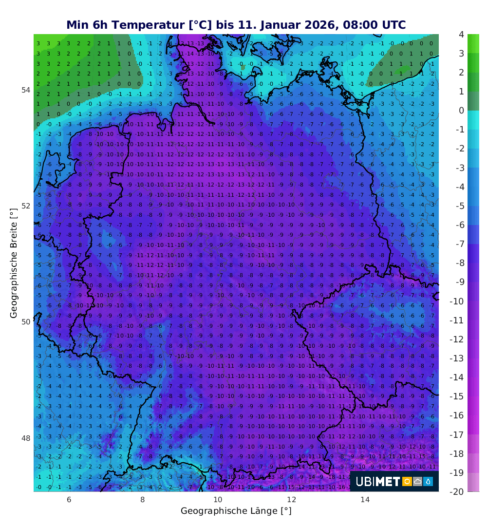 Das Einfließens deutlich kälterer Luft ist sicherlich ein Hauptgrund. Genau genommen ist es aber ein Zusammenspiel mehrerer Faktoren. So stellt sich zB. am Sonntag kurzfristig Hochdruckeinfluss ein, was vielerorts zur Wolkenauflösung und dadurch entsprechend verstärkter Wärme-Ausstrahlung führt. Über dem am gestrigen Freitag vielerorts gefallenen Schnee kühlt die Luft zudem besonders ab. Folglich zeigt das Thermometer am Sonntagmorgen verbreitet Tiefstwerte von etwa -10 Grad, teils noch darunter: