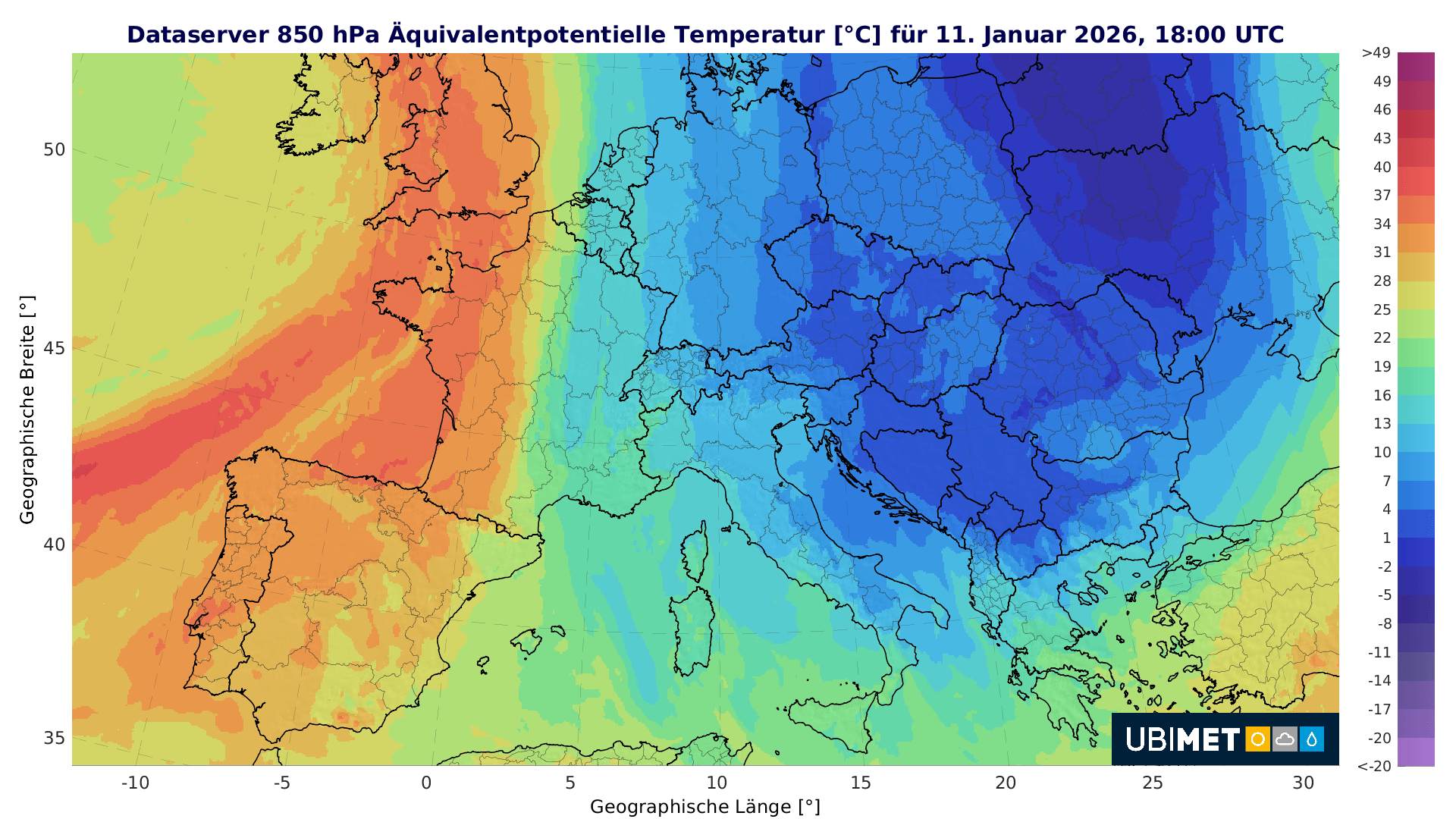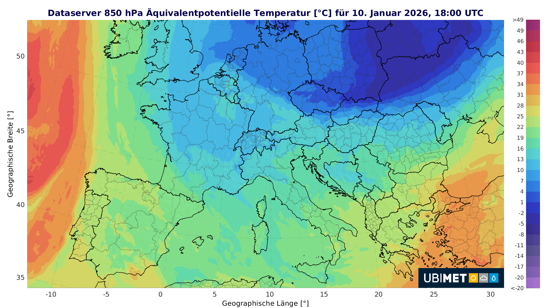 Das Sturmtief ELLI hat sich inzwischen deutlich abgeschwächt, liegt aktuell (in obiger Frontenkarte gut zu erkennen) über Süddeutschland. Dahinter strömt aus Norden wieder deutlich kältere Luft ein. Ein Blick auf den Energiegehalt der Luftmassen über Europa (siehe nächste Karte) zeigt in dunkelblau die deutlich energieärmeren, sprich kälteren Luftmassen heute bereits über Norddeutschland: