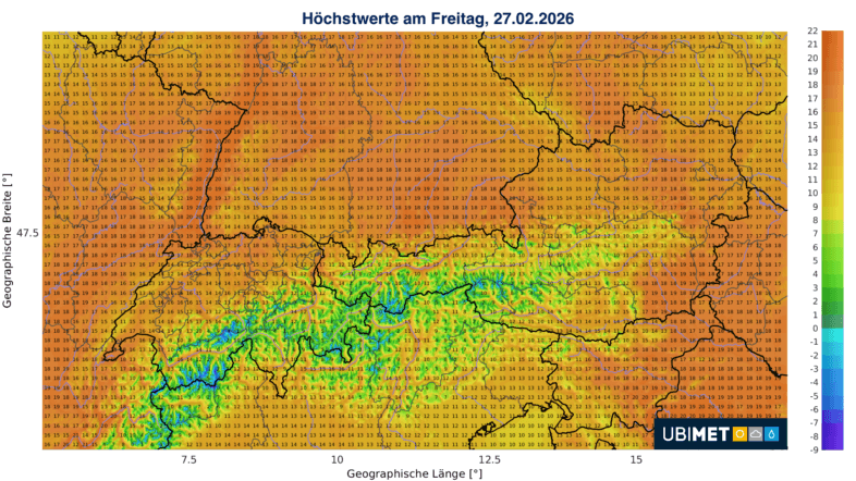 Prognose der Höchsttemperaturen am Freitag, 27.02.2026 @ UBIMET