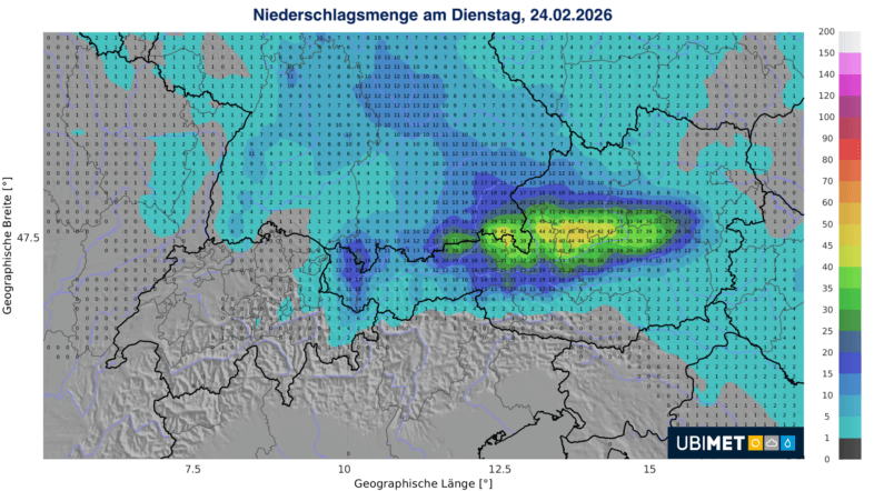 Prognose der Niederschlagsmenge am Dienstag, 24.02.2026 @ UBIMET