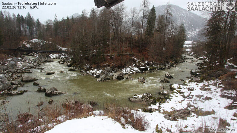Der Schnee weicht und in Verbindung mit Regen schwellen kleinere Flüsse an – Webcambild Lofer @ https://www.foto-webcam.eu/webcam/lofer/