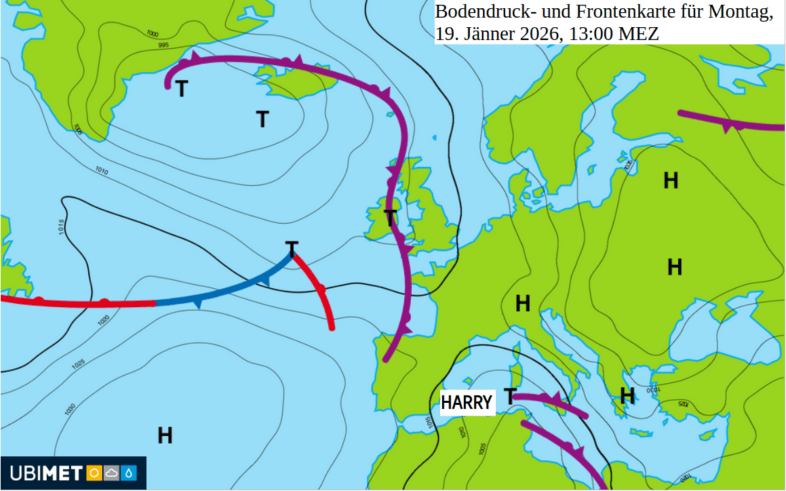 Bodendruck- und Frontenkarte für Montag, 19. Jänner 2026, 13:00 MEZ