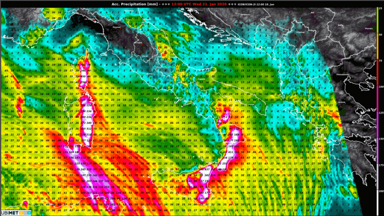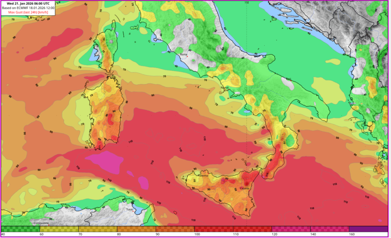 Zwischen einem ausgeprägten Hochdruckgebiet über Russland sowie einem Tiefdruckgebiet namens HARRY mit Kern über Tunesien verstärkt sich der Druckgradient und somit stellt sich eine stürmische Süd- bis Südostströmung über dem Süden von Italien ein. Außerdem hat die zugehörige Okklusion, welche nur langsam über das Land zieht und an den Bergketten regelrecht ausgequetscht wird, einiges an Niederschlag in Gepäck.