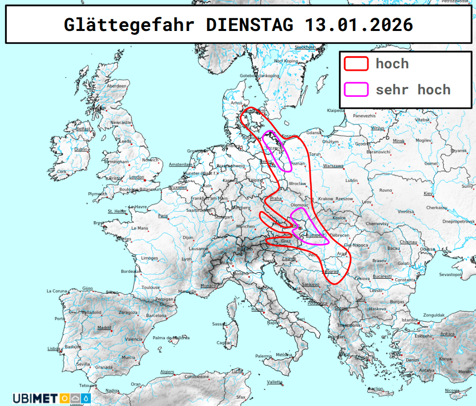 Das größte Glatteisrisiko besteht im Norden und Osten Österreichs, insbesondere im nördlichen und östlichen Flachland. Hier hält sich die Kaltluft am längsten, während gleichzeitig die Niederschläge intensiv genug sind, um rasch Eis aufzubauen. Aber auch angrenzende Becken- und Tallagen im zentralen und östlichen Bergland sind betroffen. Auch in Nachbarländern wie Deutschland, Tschechien, Slowakei und Ungarn wird die Lage bis Dienstag ähnlich schwierig. Verkehr, Infrastruktur und gebietsweise auch die Stromversorgung können dadurch beeinträchtigt werden – höchste Vorsicht ist geboten.