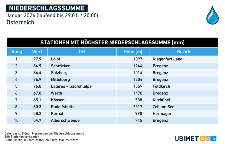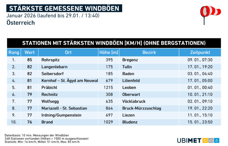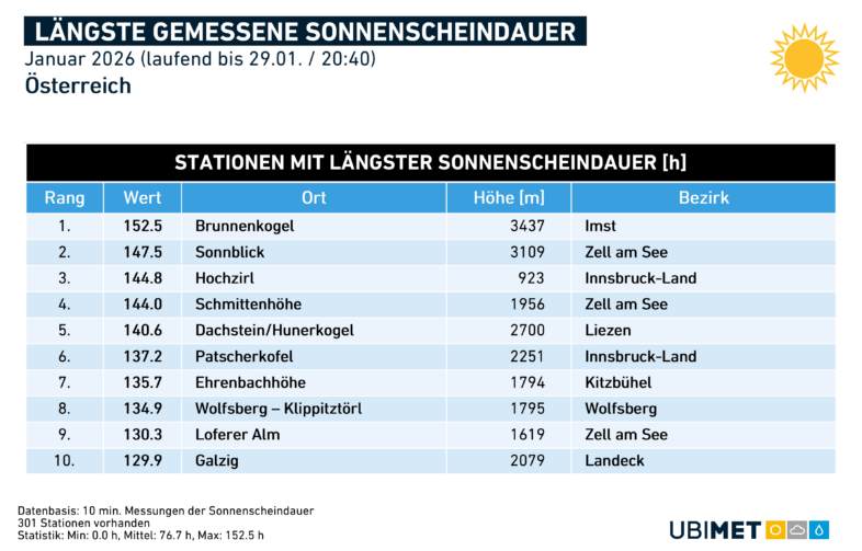 Bei der Sonnenscheindauer wurde im Jänner eine österreichweite Abweichung von +15 Prozent verzeichnet. Besonders viel Sonne – zumindest im Vergleich zum Klimamittel – gab es im westlichen Donauraum. Ein kleiner Trost nach dem rekord-trüben Dezember hier. Der Monat war nur im Südosten und im Waldviertel etwas trüber als üblich.