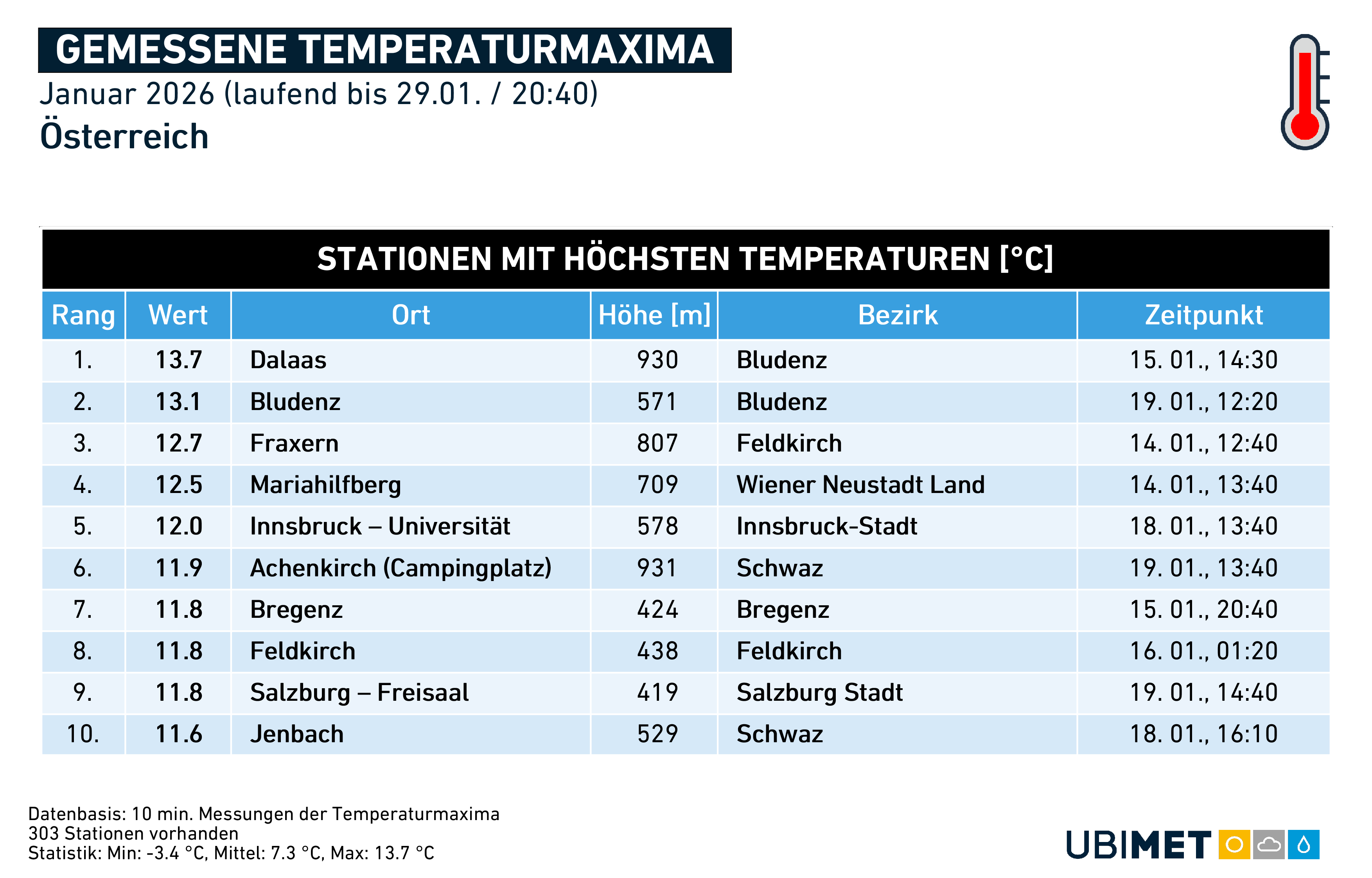 Die meist zu kalte Witterung führte zu häufigen Schneefällen. In der Nordwesthälfte fiel der Niederschlag sogar zu 80 bis 90 Prozent als Schneefall („fester Niederschlag“). Die Neuschneemengen hielten sich jedoch selbst im Bergland aufgrund der relativen Trockenheit eher in Grenzen. Die seichte, kontinentale Kaltluft brachte zudem vor allem im Norden und Osten auch relevante Eisregen-Ereignisse (siehe Beitragsbild vom Eisregen in Wien am 13.01.2026).