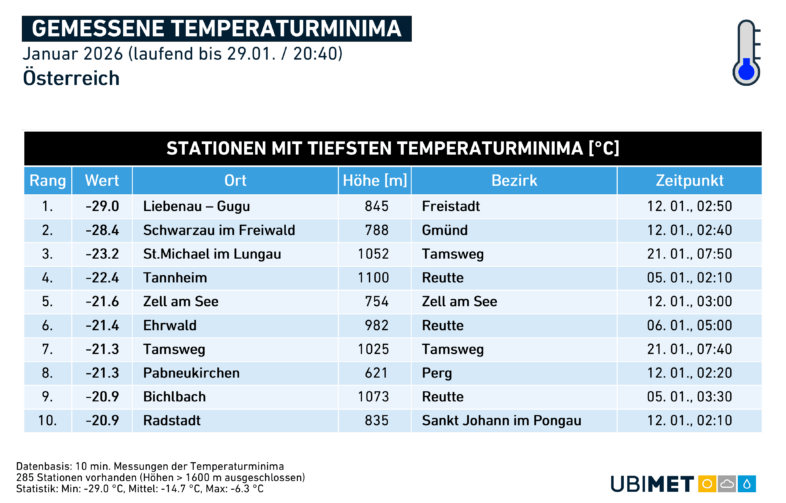 Der zu Ende gehende Jänner war besonders in den Niederungen der Osthälfte im Vergleich zum jüngeren Klimamittel 1991-2020 deutlich zu kalt. Wiederholte Ost- bis Südostlagen mit Zufuhr seichter, kontinentaler Kaltluft sorgten im gesamten Donauraum und im Südosten für Abweichungen um -2 Grad, während der Monat im Westen der Alpenrepublik nur leicht unterdurchschnittlich abschießt. Österreichweit beträgt die Temperaturanomalie etwa -1 Grad: Der kälteste Jänner seit 2017.