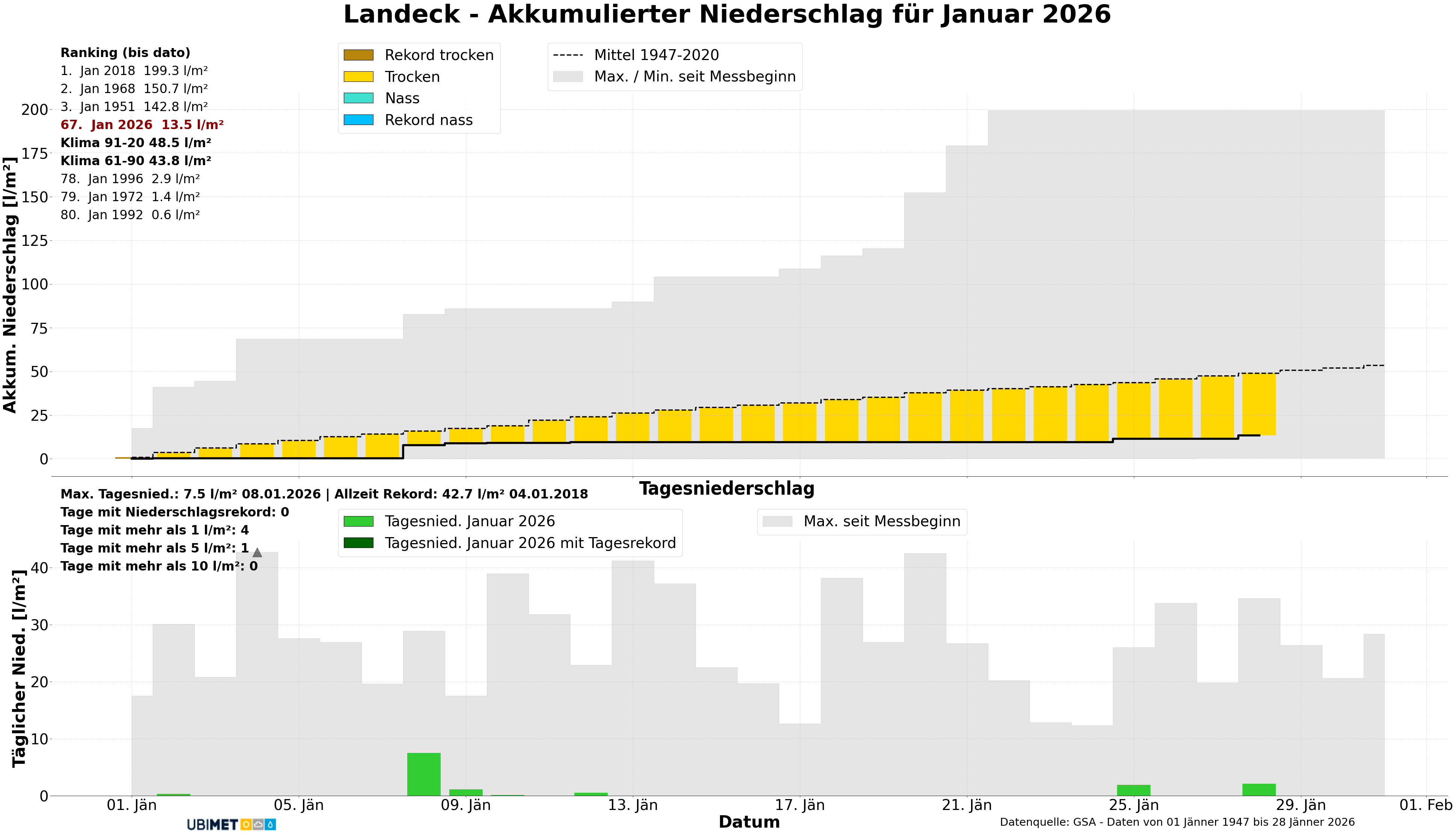 Eindeutig zweigeteilt war der Jänner 2026 in Sachen Niederschlag. In der gesamten Nordhälfte schließt der Monat deutlich zu trocken ab. Oft beträgt das Manko hier -60 bis -70 Prozent. Im Süden fallen die Anomalien deutlich geringer aus, vor allem im Grazer Becken und in der Südweststeiermark war der Monat sogar leicht zu nass. Landesweit betrachtet beträgt die Abweichung etwa -50 Prozent: Man kann durchaus von regionalen Winterdürre sprechen.
