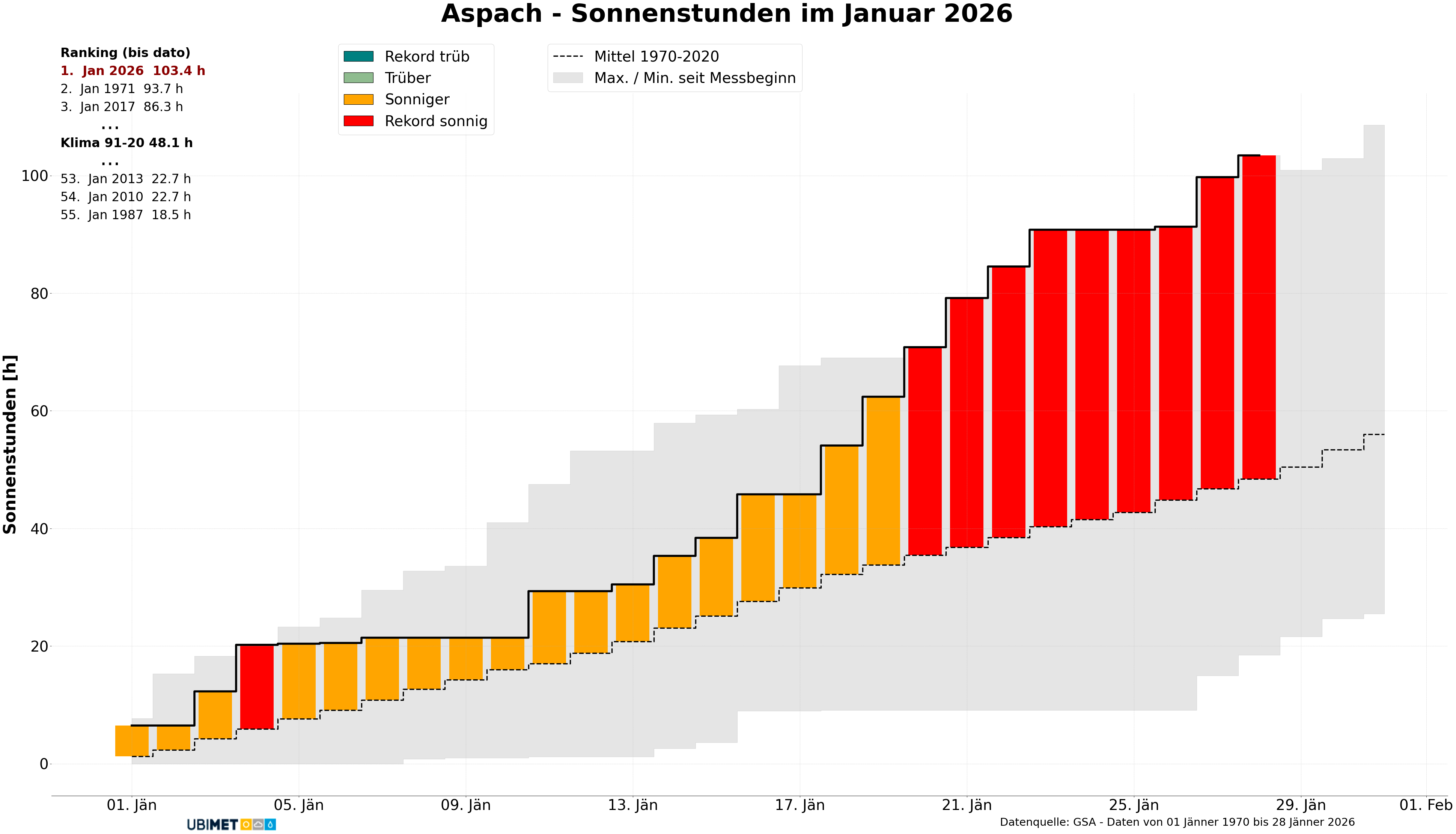 Bei der Sonnenscheindauer wurde im Jänner eine österreichweite Abweichung von +15 Prozent verzeichnet. Besonders viel Sonne – zumindest im Vergleich zum Klimamittel – gab es im westlichen Donauraum. Ein kleiner Trost nach dem rekord-trüben Dezember hier. Der Monat war nur im Südosten und im Waldviertel etwas trüber als üblich.