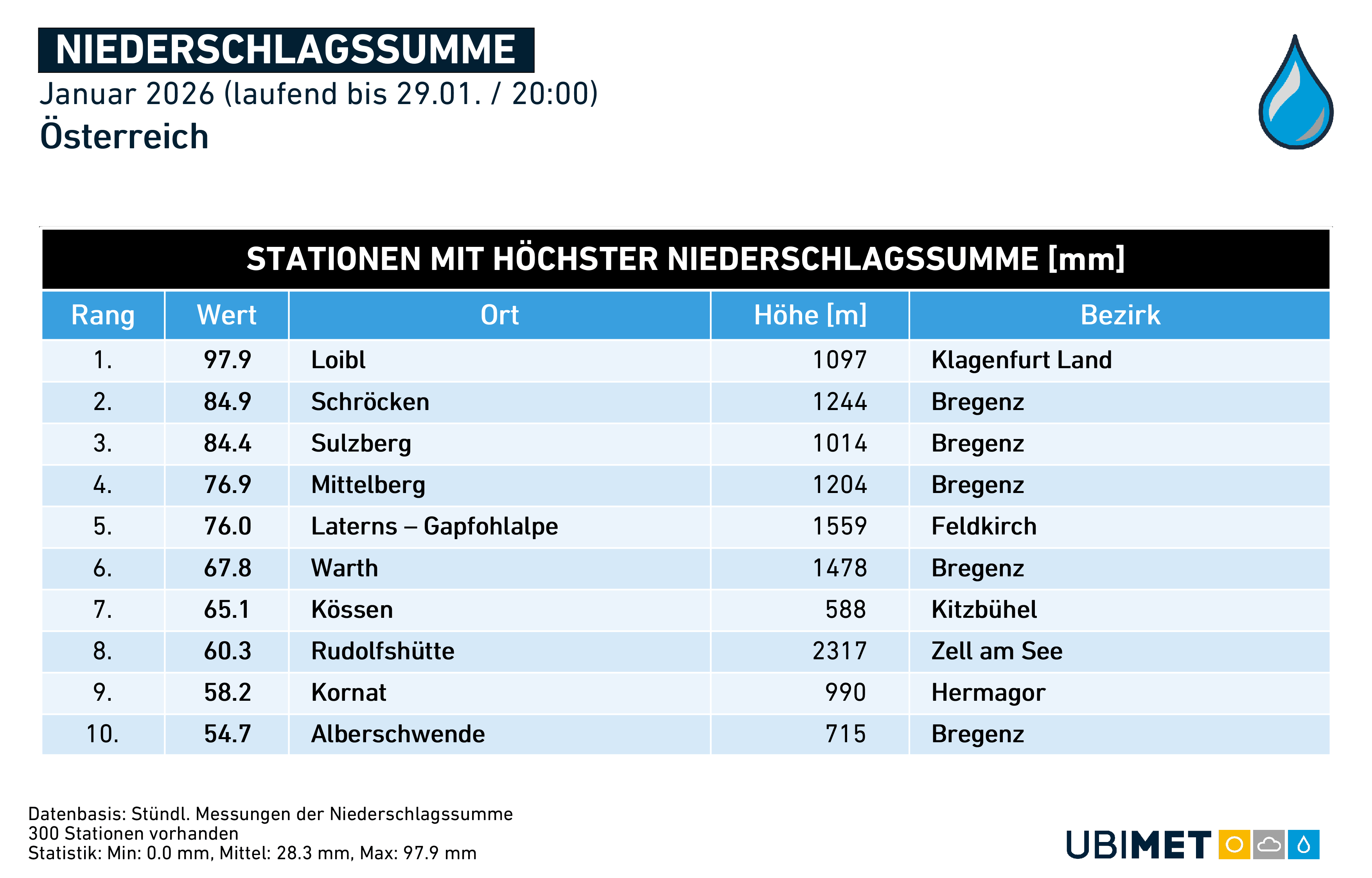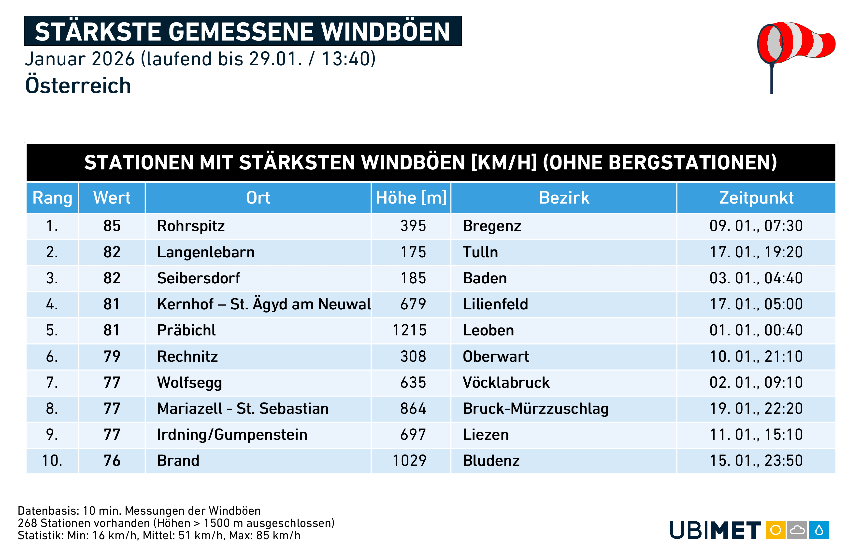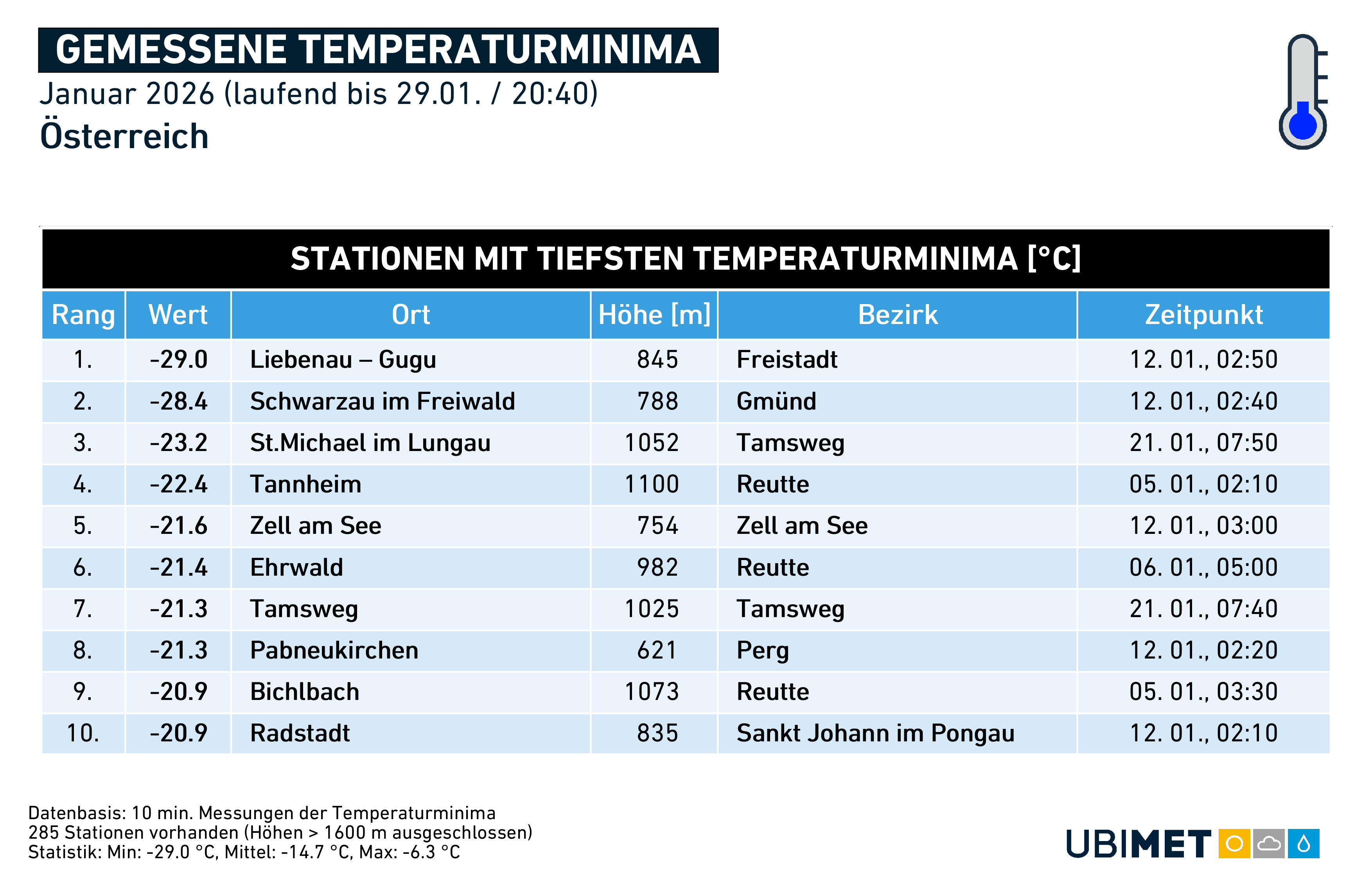 Die meist zu kalte Witterung führte zu häufigen Schneefällen. In der Nordwesthälfte fiel der Niederschlag sogar zu 80 bis 90 Prozent als Schneefall („fester Niederschlag“). Die Neuschneemengen hielten sich jedoch selbst im Bergland aufgrund der relativen Trockenheit eher in Grenzen. Die seichte, kontinentale Kaltluft brachte zudem vor allem im Norden und Osten auch relevante Eisregen-Ereignisse (siehe Beitragsbild vom Eisregen in Wien am 13.01.2026).