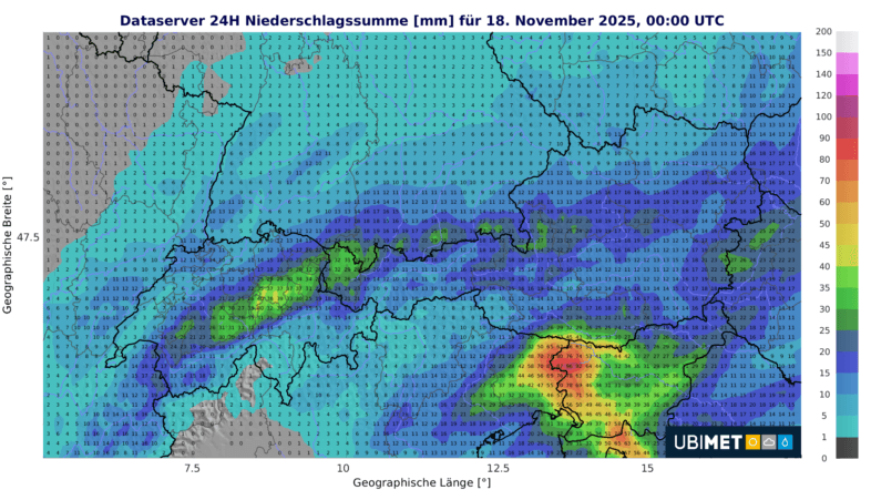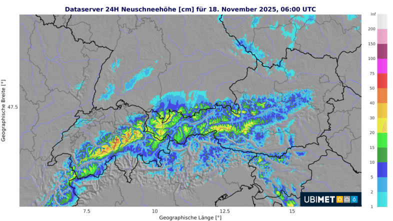 In der Nacht schneit es dann an der Alpennordseite bis in die Täler, dabei lässt die Intensität aber rasch nach. Etwa 10 bis 20 cm Neuschnee kommen auf den Bergen zusammen, in höher gelegenen Orten wie Seefeld oder im Außerfern darf man sich auf etwa 5 cm einstellen. In den größeren Tälern zuckert es hingegen nur an.
