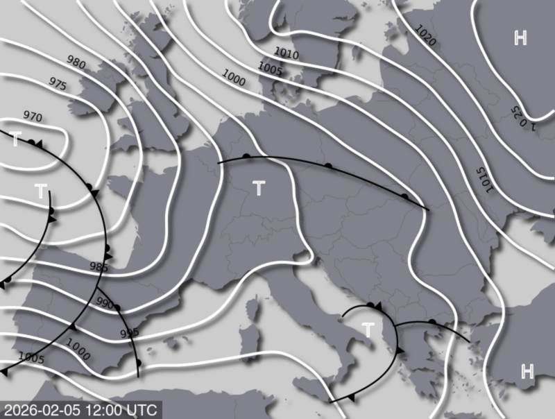 Ein Tiefdruckgebiet zieht von Norditalien über Österreich Richtung Polen. Dessen Warmfront erreicht am Donnerstag den äußersten Osten des Landes und sorgt hier für gefrierenden Regen, bzw. für Schneefall im Nordosten. In der Folge löst sich dieses kleine Tief über der Ostsee wieder auf. Am Freitag zieht im Südwesten des Landes bereits die nächste Warmfront eines Biskayatiefs auf.