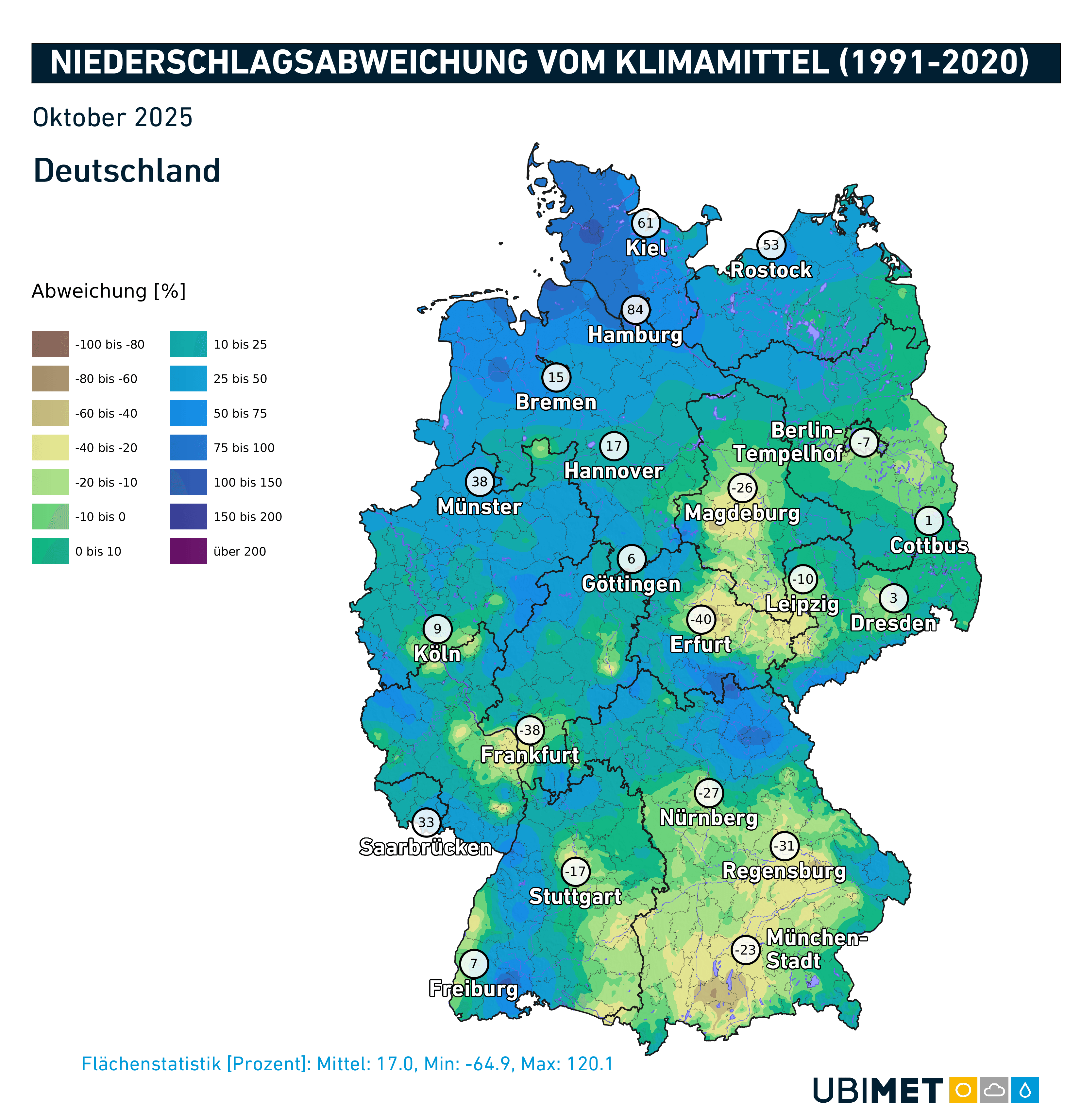 Mit flächengemittelten +17% mehr Niederschlag als ein durchschnittlicher Oktober fiel der diesjährige Herbstmonat zu nass aus. Auch hierbei stechen tiefdruckgeprägt der Monatsbeginn und das letzte Monatsdrittel heraus. Besonders die letzte Woche war medial präsent mit zahlreichen Fotos vom ersten Schneefall in den Hochlagen der Mittelgebirge. Bei den Niederschlagsmengen in Summe gab es aber ebenso lokale Unterschiede. Der Nordwesten war besonders niederschlagsreich, vergleichsweise wenig Niederschlag erhielten einige Regionen in Bayern und im Osten.