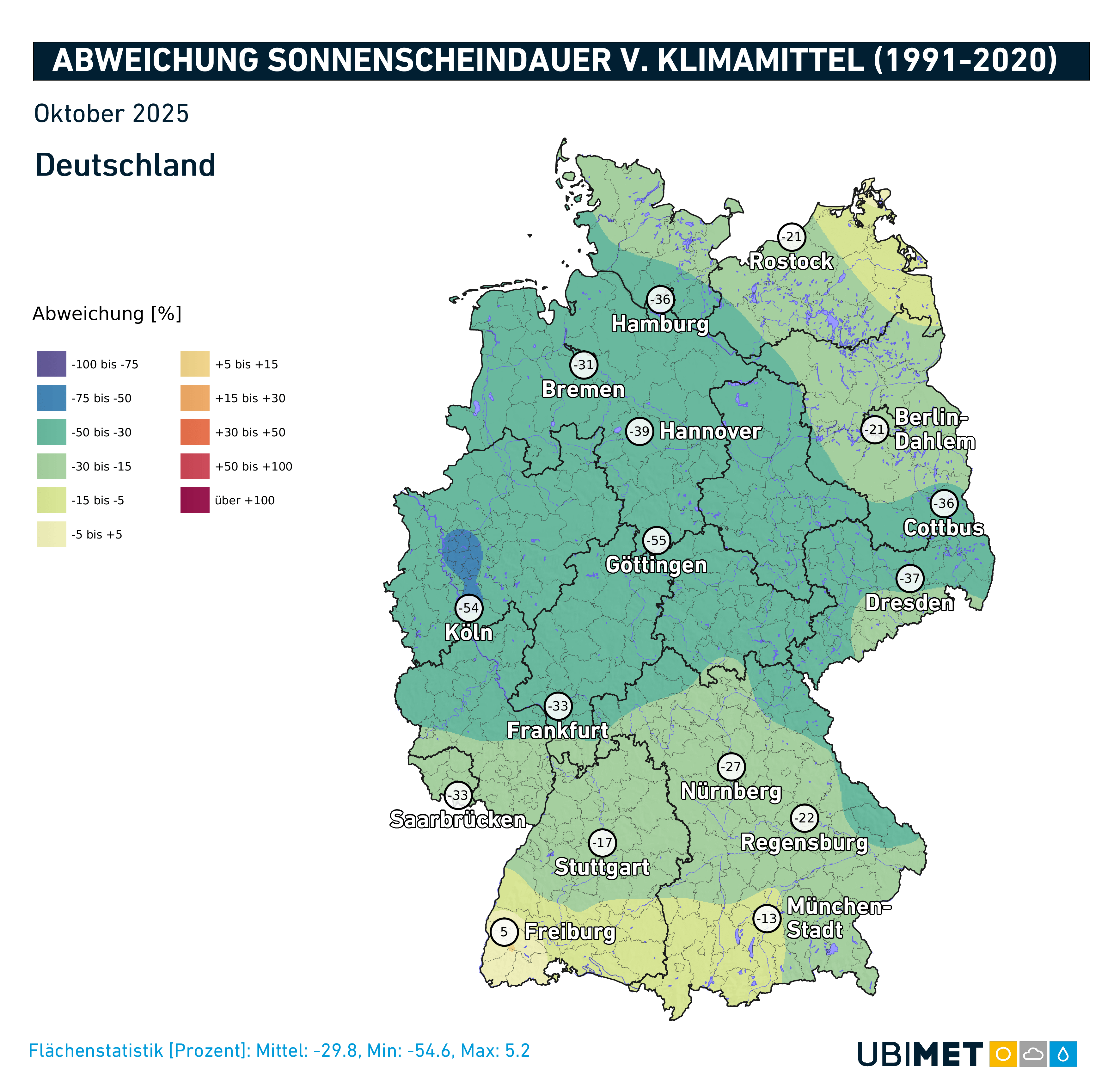 Der Oktober 2025 geht als zu trüb in die Statistik ein. Im Vergleich zu einem durchschnittlichen Oktober zeigte sich die Sonne um knappe 30 Prozent seltener. Besonders die Mitte und der Westen des Landes erhielten sehr wenige sonnige Phasen, im Mittel etwa nur 2 Stunden schien dort die Sonne pro Tag. Ein stetiger Zustrom feuchter Luftmassen mit folglich oft dichter Wolkendecke hinterließ kaum einen Golden-Oktober-Eindruck.