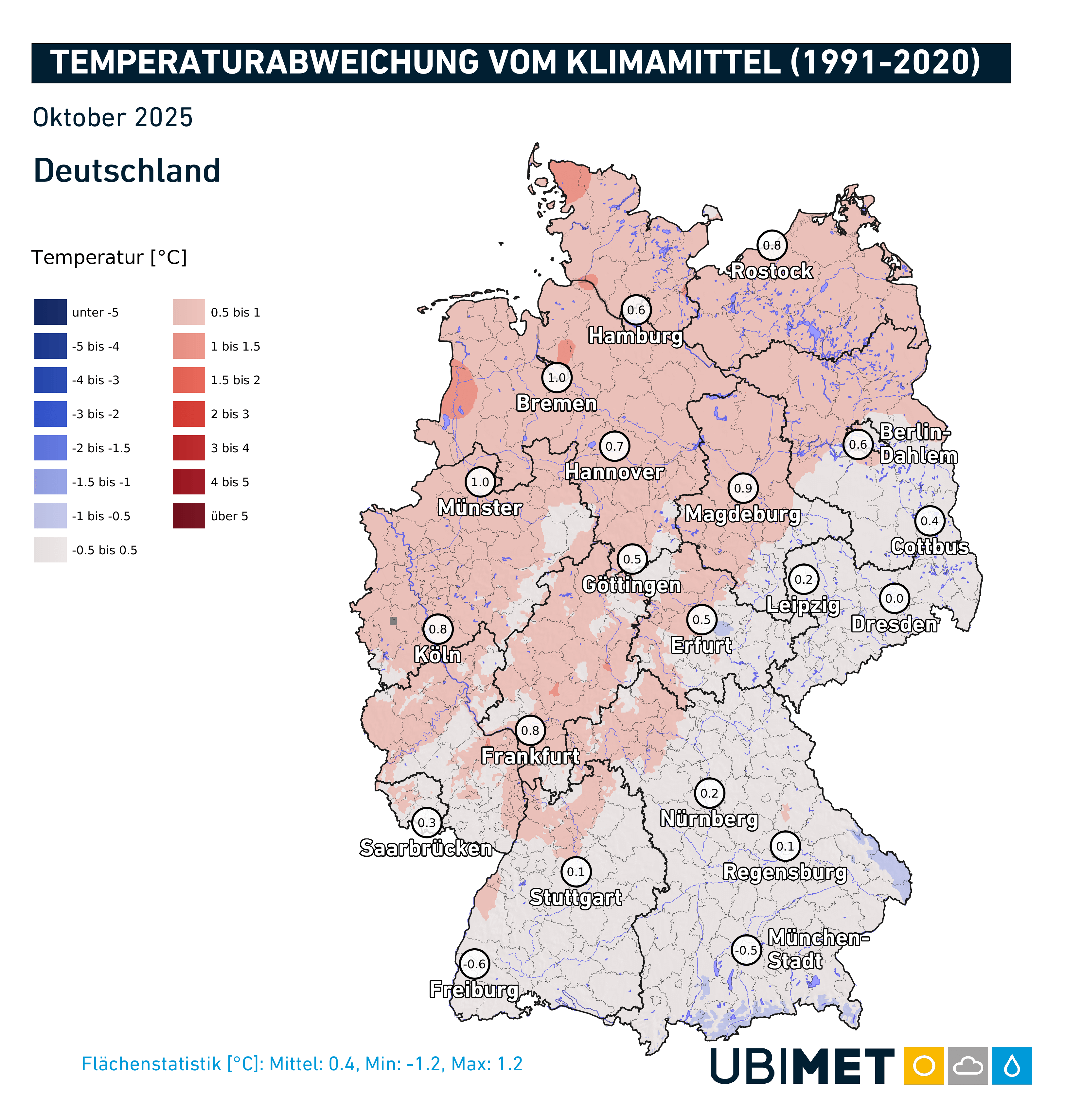 In Summe bilanziert der Oktober 2025 mit einem +0,5 Grad Überschuss gegenüber der Referenzperiode von 1991 bis 2020 mit einem Nordwest-Südost-Temperaturgefälle.