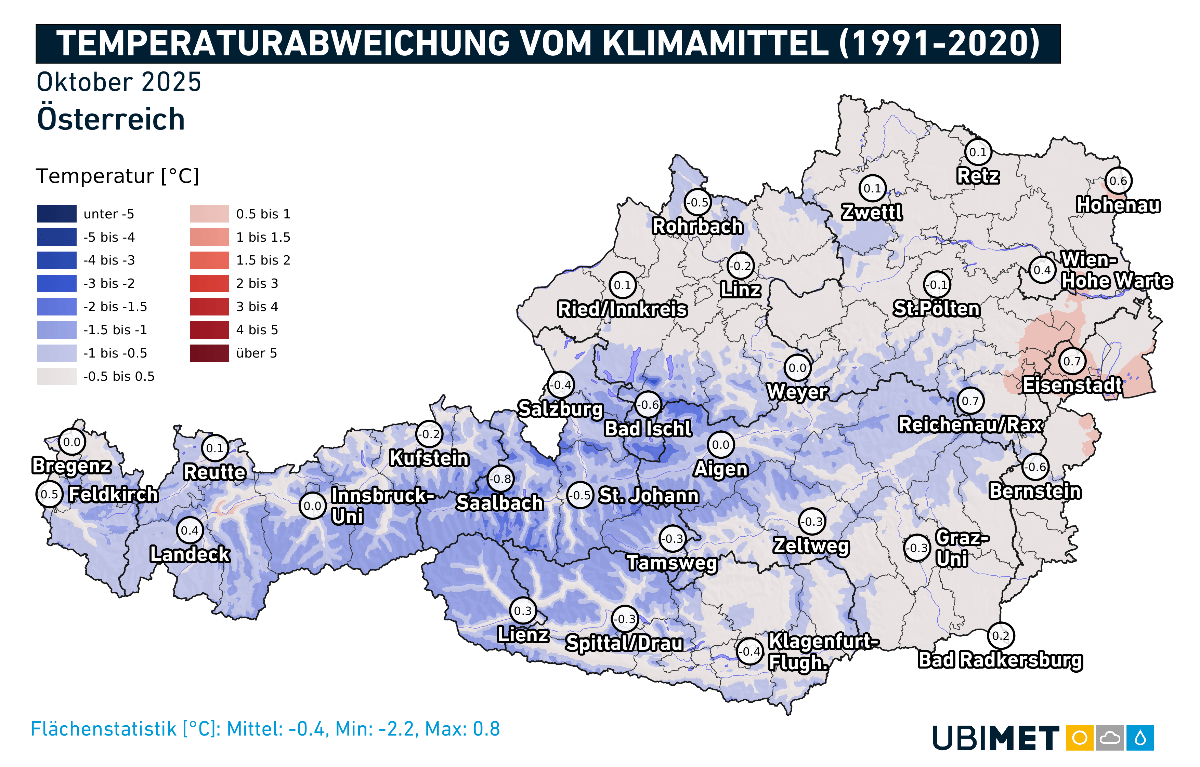 Österreichweit fiel der Oktober eine Spur kühler als im langjährigen Mittel von 1991 bis 2020 aus. Besonders auf den Bergen der Nordalpen war der Monat sogar spürbar zu kühl. Die größten Abweichungen von rund -1,5 Grad wurden unter anderem in Obertauern, auf der Schmittenhöhe und auf dem Patscherkofel verzeichnet. In den Tälern waren die Anomalien deutlich moderater, hier fiel der Oktober ziemlich durchschnittlich aus. Positive Anomalien waren rar gesät, doch es gab sie: Im Rheintal und im östlichen Flachland bilanziert der Monat rund ein halbes Grad zu mild.