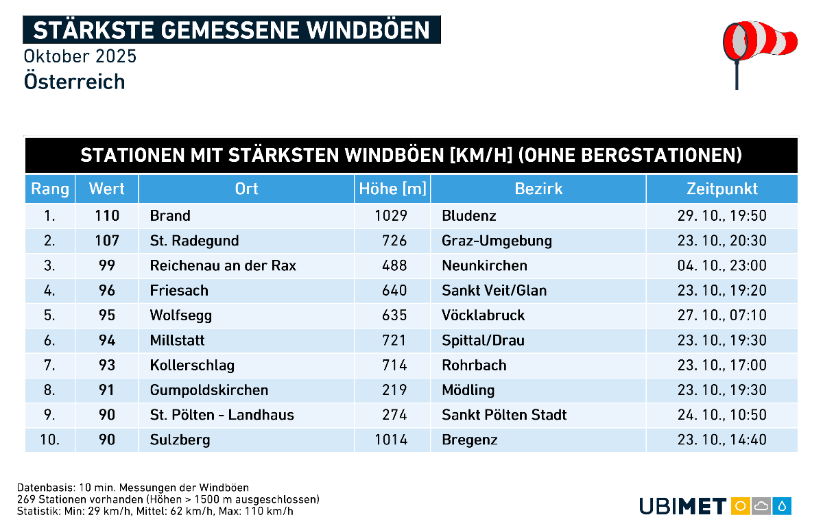 Markante Herbststürme blieben zwar aus, mit Durchzug einer Kaltfront am 23. des Monats frischte der Wind aber verbreitet stürmisch auf. In St. Radegund bei Graz wurden 107 km/h gemessen, 96 km/h waren es in Friesach und 94 km/h Millstatt. Letzterer Wert war gleichbedeutend mit einem neuen Herbstrekord am Millstätter See.