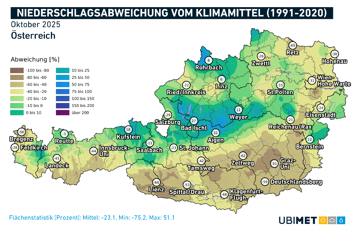Österreichweit fiel der Oktober eine Spur kühler als im langjährigen Mittel von 1991 bis 2020 aus. Besonders auf den Bergen der Nordalpen war der Monat sogar spürbar zu kühl. Die größten Abweichungen von rund -1,5 Grad wurden unter anderem in Obertauern, auf der Schmittenhöhe und auf dem Patscherkofel verzeichnet. In den Tälern waren die Anomalien deutlich moderater, hier fiel der Oktober ziemlich durchschnittlich aus. Positive Anomalien waren rar gesät, doch es gab sie: Im Rheintal und im östlichen Flachland bilanziert der Monat rund ein halbes Grad zu mild.