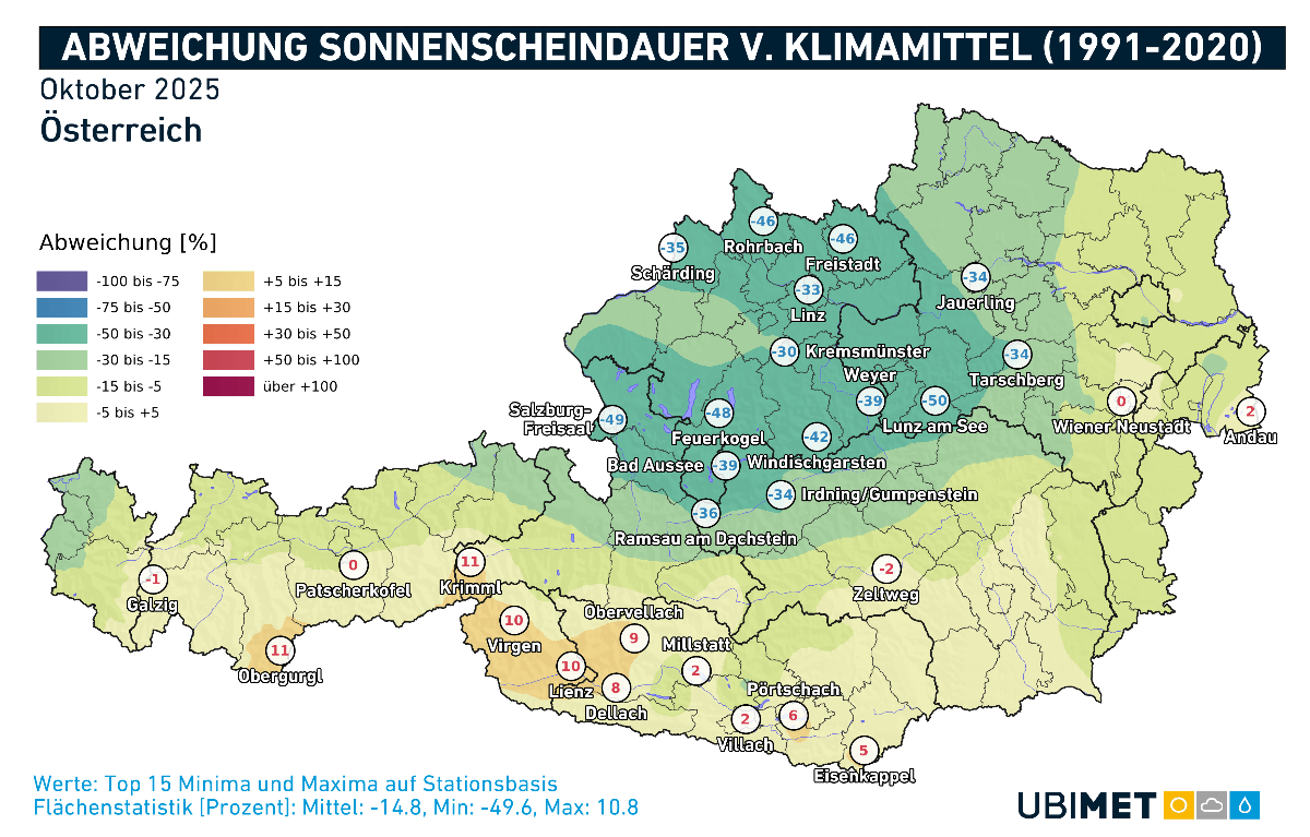 Im Flächenmittel wurden im Oktober rund 15 Prozent weniger Sonnenstunden als üblich verzeichnet. Das größte Defizit wurde rund um Oberösterreich gemessen, wo die Abweichungen oft bei -30 bis -50 Prozent lagen. Im Mühlviertel etwa und in den Staulagen der Nordalpen fehlt am Ende des Monats rund die Hälfte der sonst üblichen Sonnenstunden. Überduchschnittlich sonnige Ort gab es im Oktober kaum, einzig Osttirol kann mit einem Plus an Sonnenstunden von rund 10 Prozent aufwarten.