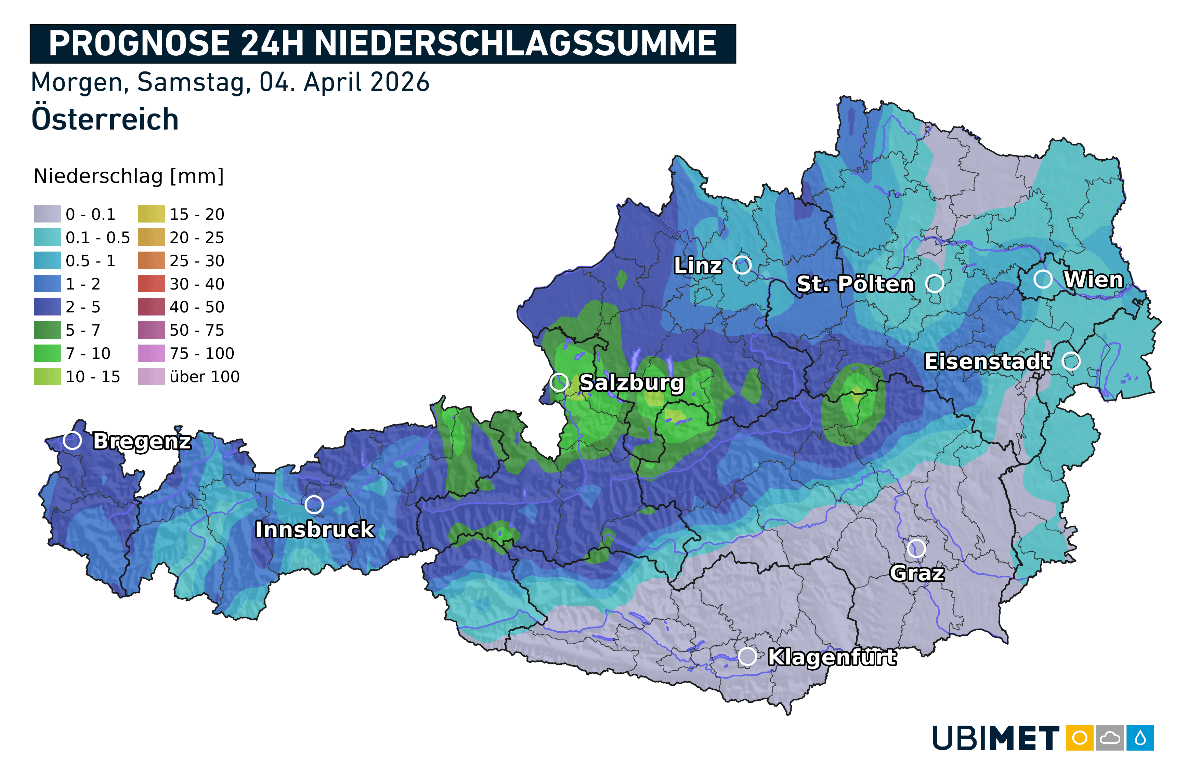 Am Karsamstag bringt eine Warmfront viele Wolken und besonders vom Tiroler Unterland bis ins westliche Niederösterreich fällt zeitweise etwas Regen. Im Süden, im östlichen Flachland und auch ganz im Westen lockert es am Nachmittag auf und die Sonne lässt sich noch ab und zu blicken, am häufigsten scheint sie vom Lienzer bis zum Villacher Becken. Der Wind weht mäßig, vom Mostviertel bis ins Wiener Becken lebhaft aus West. Die Höchstwerte liegen zwischen 8 und 18 Grad.