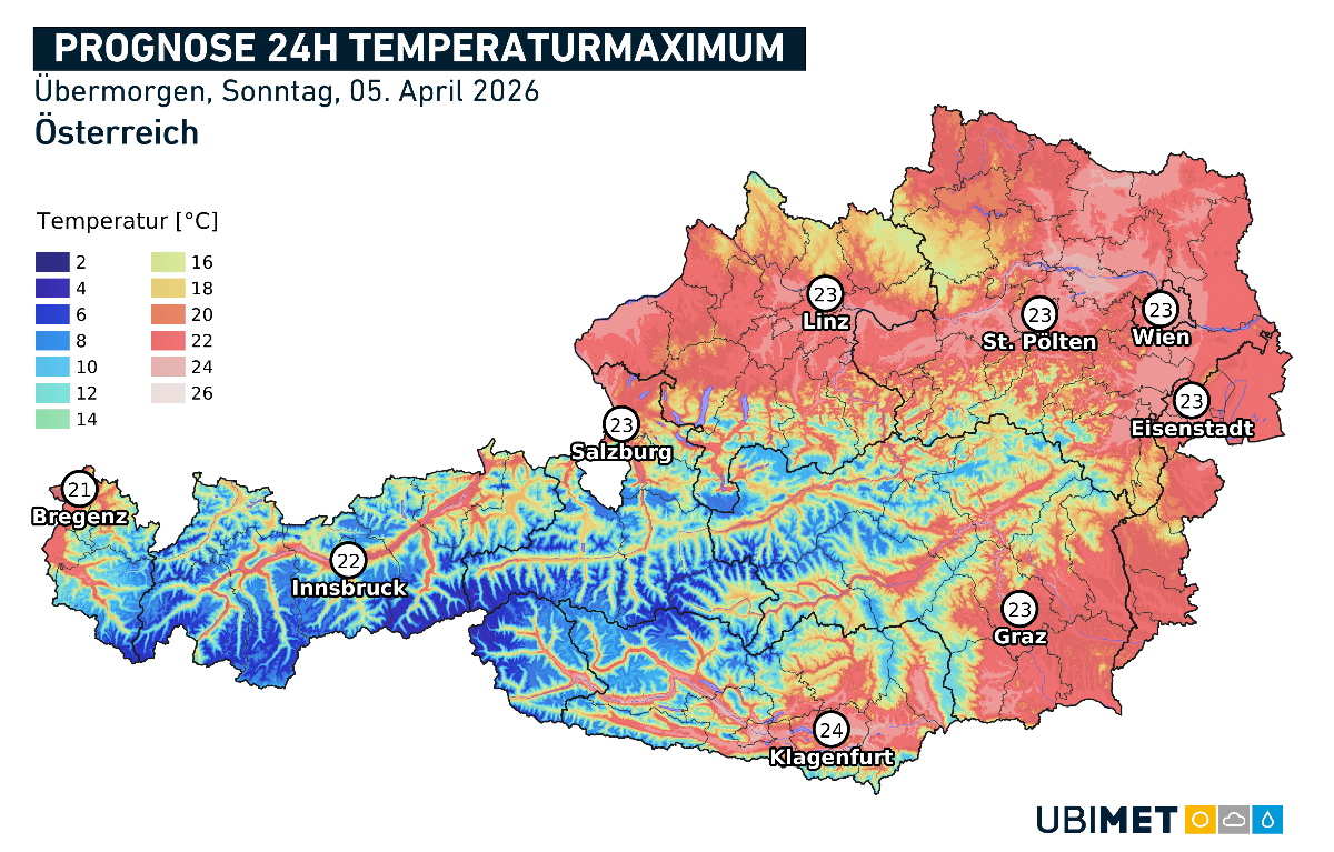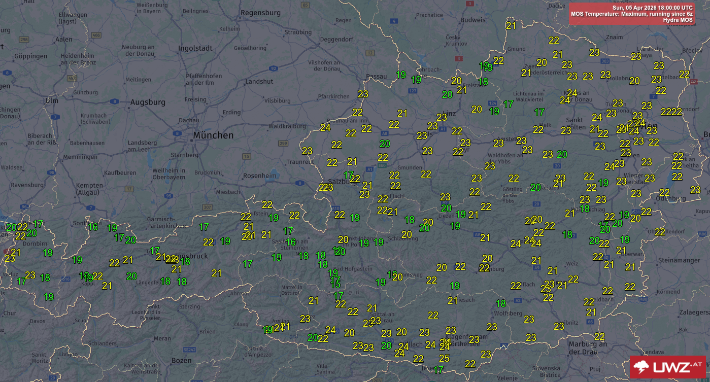 Pünktlich zum Ostersonntag sorgt ein Zwischenhoch verbreitet für sonniges und warmes Wetter. Tagsüber ziehen ein paar Schleier- und Quellwolken durch, welche aber harmlos bleiben und den weiterhin vorherrschenden Sonnenschein kaum trüben. Die Temperaturen steigen bei meist nur schwachem Wind auf 17 bis 24 Grad, lokal sind Süden auch Spitzen bis 25 Grad möglich. Ab dem späten Abend nimmt dann von Vorarlberg bis ins Waldviertel die Schauerneigung zu, vereinzelt entstehen auch Gewitter.