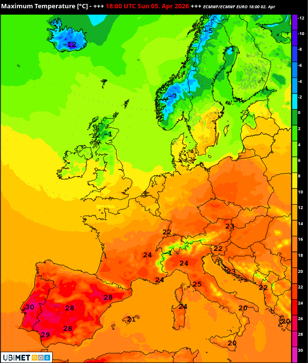 Prognose der Höchstwerte am Ostersonntag: Im Bergland Skandinaviens herrscht Dauerfrost, während es in Südwesteuropa hochsommerlich warm wird.