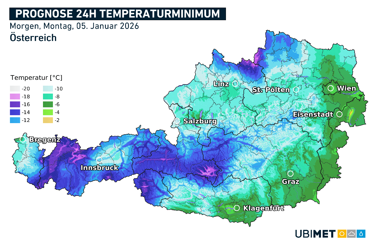 Die typischen Kältepole Österreichs finden sich einmal mehr zum einen im Oberen Waldviertel und im angrenzenden Mühlviertel, zum anderen in manchen Hochtälern der Alpen. So werden in der Nacht auf Montag etwa in Lech am Arlberg, im Außerfern, im Defereggental und im Lungau örtlich Tiefstwerte um -20 Grad erwartet. Im Freiwald und im Raum Liebenau sind lokal sogar Temperaturen von bis zu -25 Grad möglich.