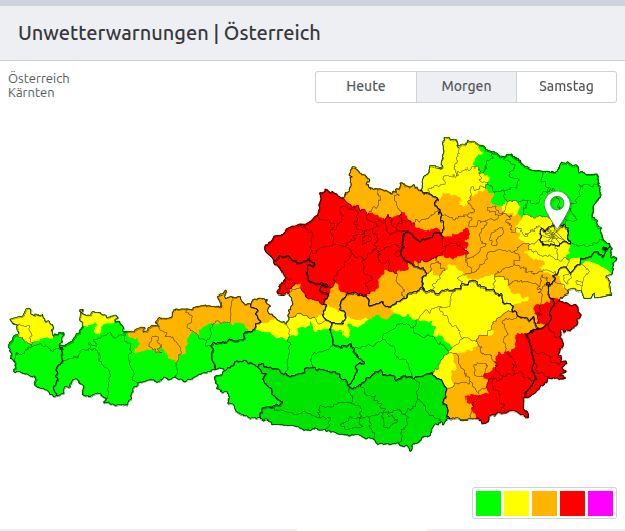 Im Laufe der Nacht auf Freitag steigt die Schneefallgrenze von Vorarlberg bis ins westliche und südliche Oberösterreich generell gegen 1000 bis 1300 m an. Abseits mancher inneralpinen Täler, in denen es weiterhin bei Schneefall bleibt, geht der anfängliche Schneefall bis zu den Morgenstunden am Freitag somit zunehmend in gefrierenden Regen über. Besonders im Salzburger Flachgau sowie in Oberösterreich ist mit teils erheblicher Glätte zu rechnen. Am Vormittag breitet sich der Niederschlag weiter ostwärts aus und erreicht zunächst auch den Osten, später auch den Südosten des Landes. Zunächst fällt häufig Schnee, im weiteren Verlauf ist hier mit einer Mischung aus Schneefall, Schneeregen, Eiskörnern und gebietsweise gefrierendem Regen zu rechnen. Besonders entlang der Donau bis zum Wienerwald und im Waldviertel ist dann ebenso mit teils erheblicher Glätte zu rechnen, im weiteren Verlauf steigt das Glätterisiko auch von der südlichen Steiermark bis ins Süd- und Mittelburgenland an. Im Wiener Raum und im Weinviertel ist das Risiko nach derzeitigem Stand etwas geringer, hier wird es meist bei Schneefall bleiben.