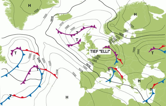 In der Nacht auf Freitag erreicht uns die Warmfront des Tiefs „Elli“, das sich am Donnerstag vom Ärmelkanal in Richtung Deutschland verlagert hat. Dabei schiebt sich vorübergehend milde Atlantikluft über die bestehende Kaltluft. Der Schneefall geht von Westen her regional allmählich in Regen beziehungsweise gefrierenden Regen über. Aufgrund der ausgeprägten Kaltluftschicht am Boden können auch Eiskörner auftreten.