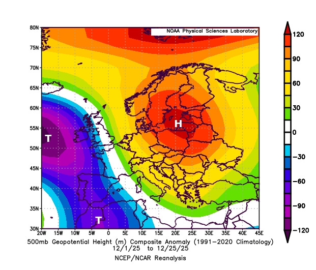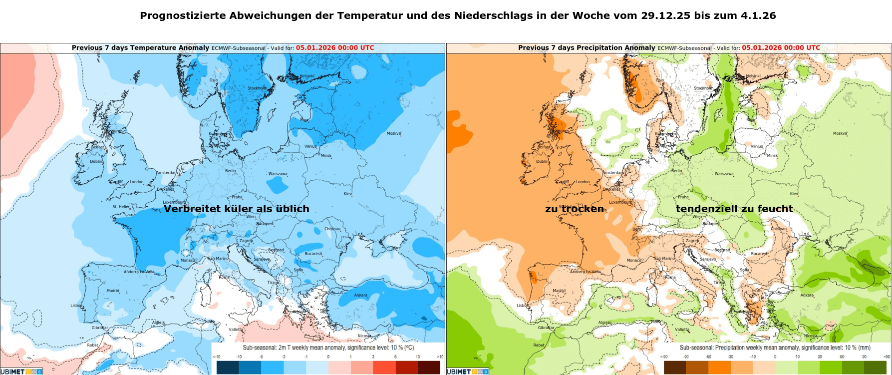 Das Jahresende bringt nur regional eine leichte Linderung der Trockenheit: Das blockierende Hoch über Nordeuropa verlagert sein Zentrum etwas weiter nach Westen zum Nordatlantik. Im Nordosten Österreichs machen sich Tiefausläufer aus Nordeuropa bemerkbar, im Westen überwiegt weiterhin der Hochdruckeinfluss. Nach dem Jahreswechsel verstärkt sich in Mitteleuropa generell der Tiefdruckeinfluss, wodurch auch im Westen die Chancen auf Niederschlag zunehmen.