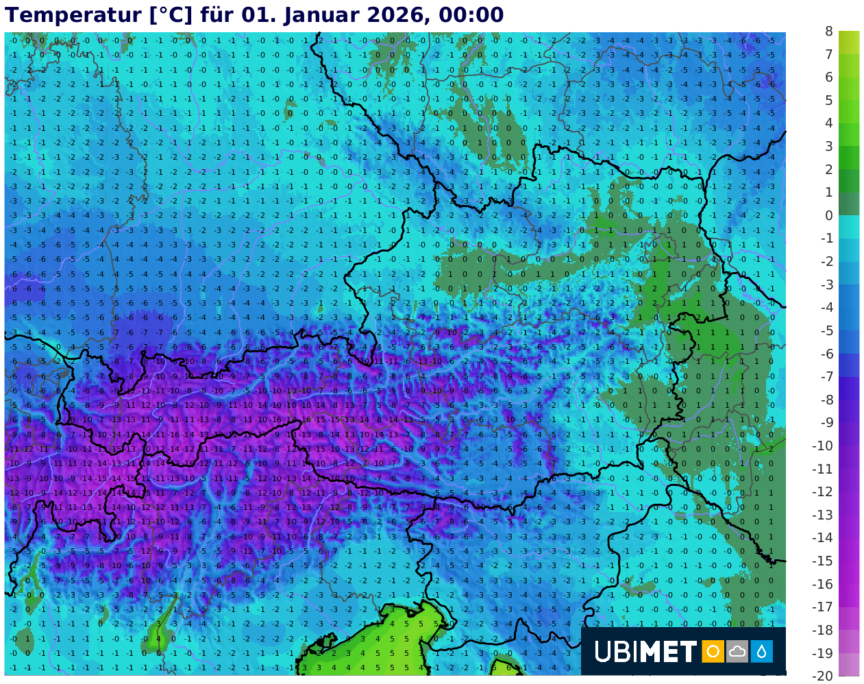 Der Donnerstag, Neujahr, startet im Nordosten mit Restwolken und vereinzelt fallen im Bergland noch ein paar Schneeflocken. Am Vormittag trocknet es rasch ab und die Wolken lockern auf, nachfolgend scheint bei einigen Schleierwolken landesweit zumindest zeitweise die Sonne. Der Wind weht mäßig, anfangs auch noch lebhaft aus westlichen bis südlichen Richtungen. Maximal werden -2 bis +5 Grad erreicht.