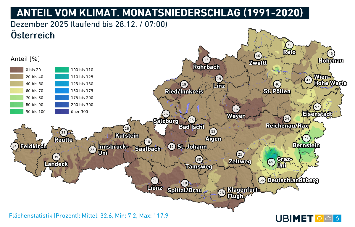 Im Flächenmittel gab es im Dezember in Österreich bislang nur 35 Prozent der üblichen Niederschlagsmenge, was dem trockensten Dezember seit 2016 entspricht. Besonders trocken war es in den Alpen, wo die vorläufige Niederschlagsbilanz mancherorts bei minus 80 Prozent liegt und entsprechend akuter Schneemangel herrscht.
