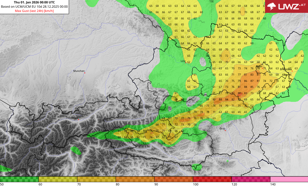 Der Mittwoch, Silvester, beginnt meist trocken und vor allem im Westen und Süden sonnig aufgelockert. Im Norden werden die Wolken jedoch dichter und tagsüber setzt vom Mühl- bis ins Weinviertel leichter Schneefall ein, welcher sich am Nachmittag auf den gesamten Norden und Osten ausbreitet. Im Süden und Westen bleibt es trocken. Der Wind legt weiter zu und weht im Norden und Osten zeitweise stürmisch aus West. Die Höchstwerte zwischen -3 und +4 Grad.