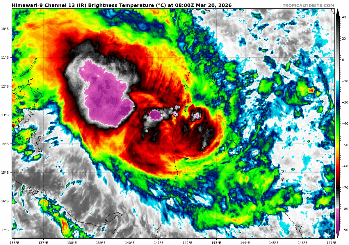 Die Meeresoberflächentemperaturen vor den Küsten im Norden Australiens liegen weiterhin verbreitet über 29 °C und somit sind die Bedingungen für die Tiefdruckentwicklung hervorragend. Infrarotsatellitenbilder zeigen sehr kalte Wolkenobergrenzen (bis etwa −90 °C), was auf intensive konvektive Prozesse hinweist.