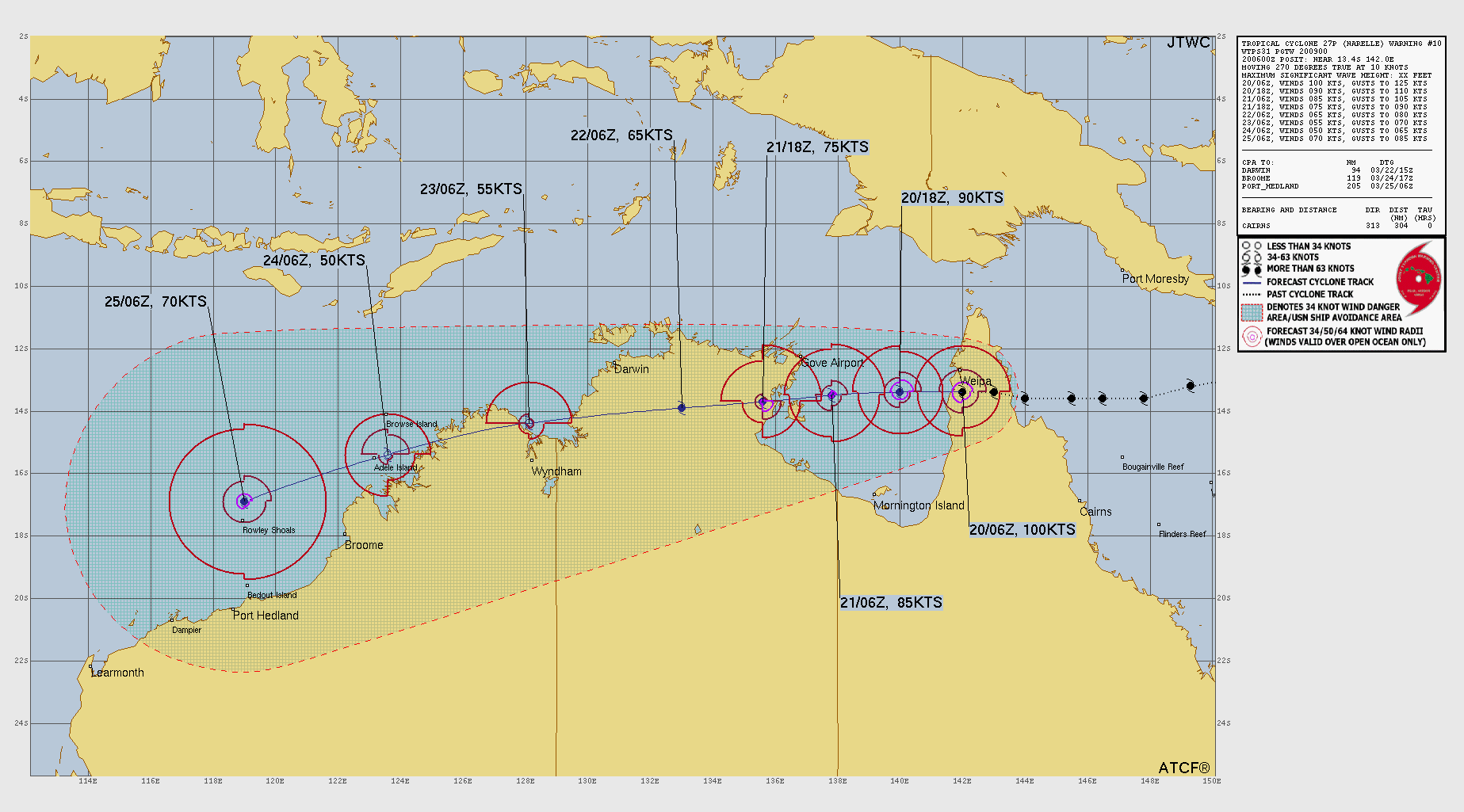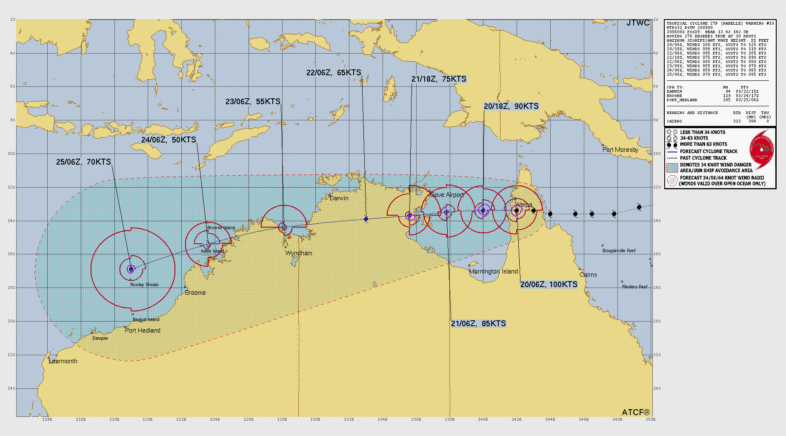 Unter diesen Bedingungen wird eine erneute Intensivierung prognostiziert, wobei nach aktuellen Modellrechnungen eine Verstärkung bis Kategorie 3 vor dem nächsten Landfall an der Küste des Northern Territory wahrscheinlich ist (Samstagabend/-nacht).