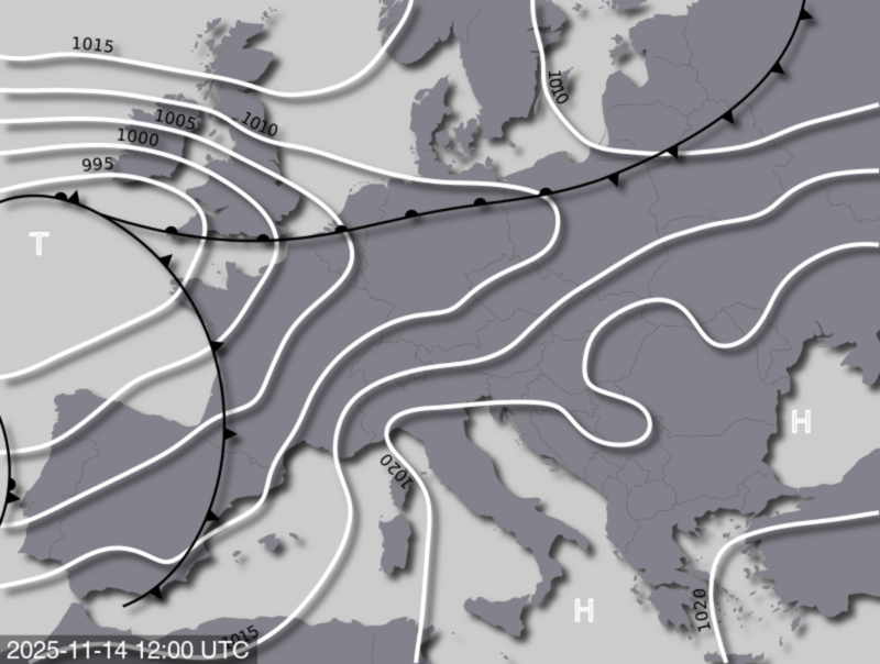 Am Freitag liegt der Alpenraum zwischen dem ausgedehnten Hoch WENCKE über Osteuropa und einer Tiefdruckrinne, die sich von Nordskandinavien bis zu den Azoren erstreckt, in einer sehr milden südwestlichen Höhenströmung. In den Niederungen herrscht eine hohe Neigung zu Nebel und Hochnebel. Die ruhige Wetterlage bleibt zumindest bis zum Wochenende bestehen. Im Laufe des Sonntags wird es nach der Bildung eines Italientiefs von Süden her allmählich unbeständiger. Am Montag leitet eine markante Kaltfront in Verbindung mit einem Italientief eine frühwinterliche Wetterphase ein.