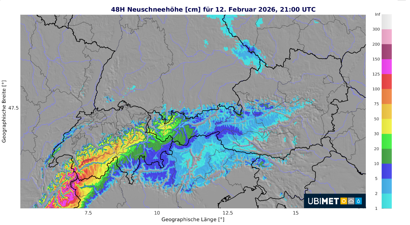 Besonders erfreulich sind die Aussichten für die Alpennordseite. Durch die rasche Abfolge von Warm- und Kaltfronten werden von Vorarlberg bis zum Mostviertel verbreitet 25 bis 50 l/m² Niederschlag erwartet – am Arlberg lokal sogar mehr. Auch wenn es in den Tälern zeitweise regnet, bedeutet der Neuschnee in den höheren Lagen ein wichtiges Aufatmen für die Skigebiete.