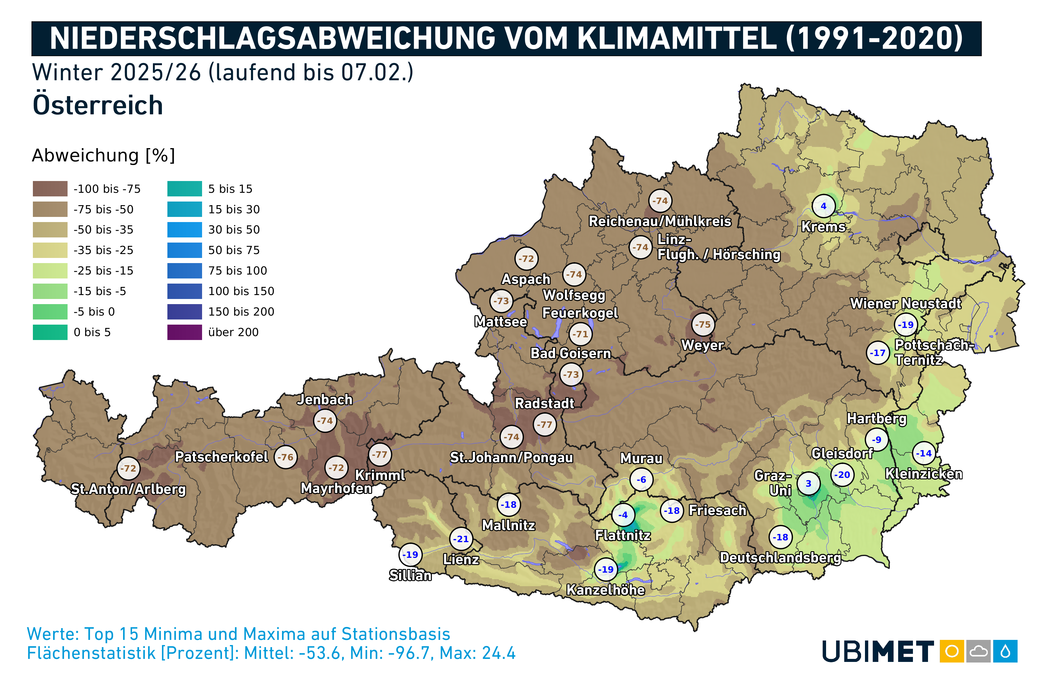 Der meteorologische Winter 2025/26 zeigte sich bislang von seiner extrem trockenen Seite. Seit dem 1. Dezember herrscht in weiten Teilen des Landes ein massives Niederschlagsdefizit – im landesweiten Schnitt fehlt gut die Hälfte der üblichen Regen- und Schneemengen. In Regionen wie dem Arlberg oder dem Ennstal liegt das Minus sogar bei rund 75 Prozent. Lokal steuern wir derzeit auf einen der trockensten Winter der Messgeschichte zu. Doch nun ist ein Ende der blockierenden Wetterlage in Sicht.