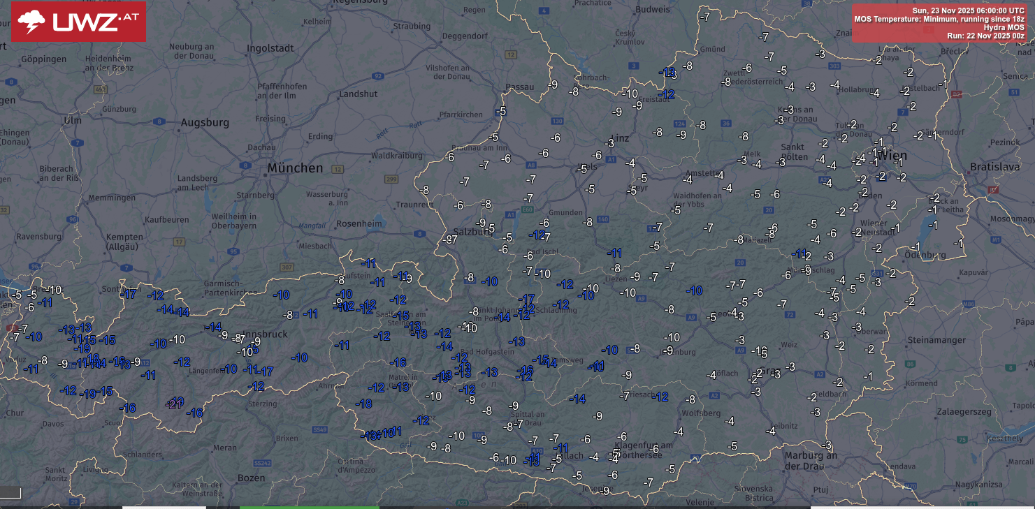 In der Nacht auf Sonntag klart es im Westen regional auf, wodurch es ideale Bedingungen für eine noch kältere Nacht gibt. Von Vorarlberg bis in die westliche Obersteiermark sowie in Osttirol und Oberkärnten kündigt sich vielerorts strenger Frost um -10 Grad an, in manchen Hochtälern wie etwa in Lech am Arlberg geht es sogar in Richtung -20 Grad. Aktuelle Wetterdaten kann man hier verfolgen.