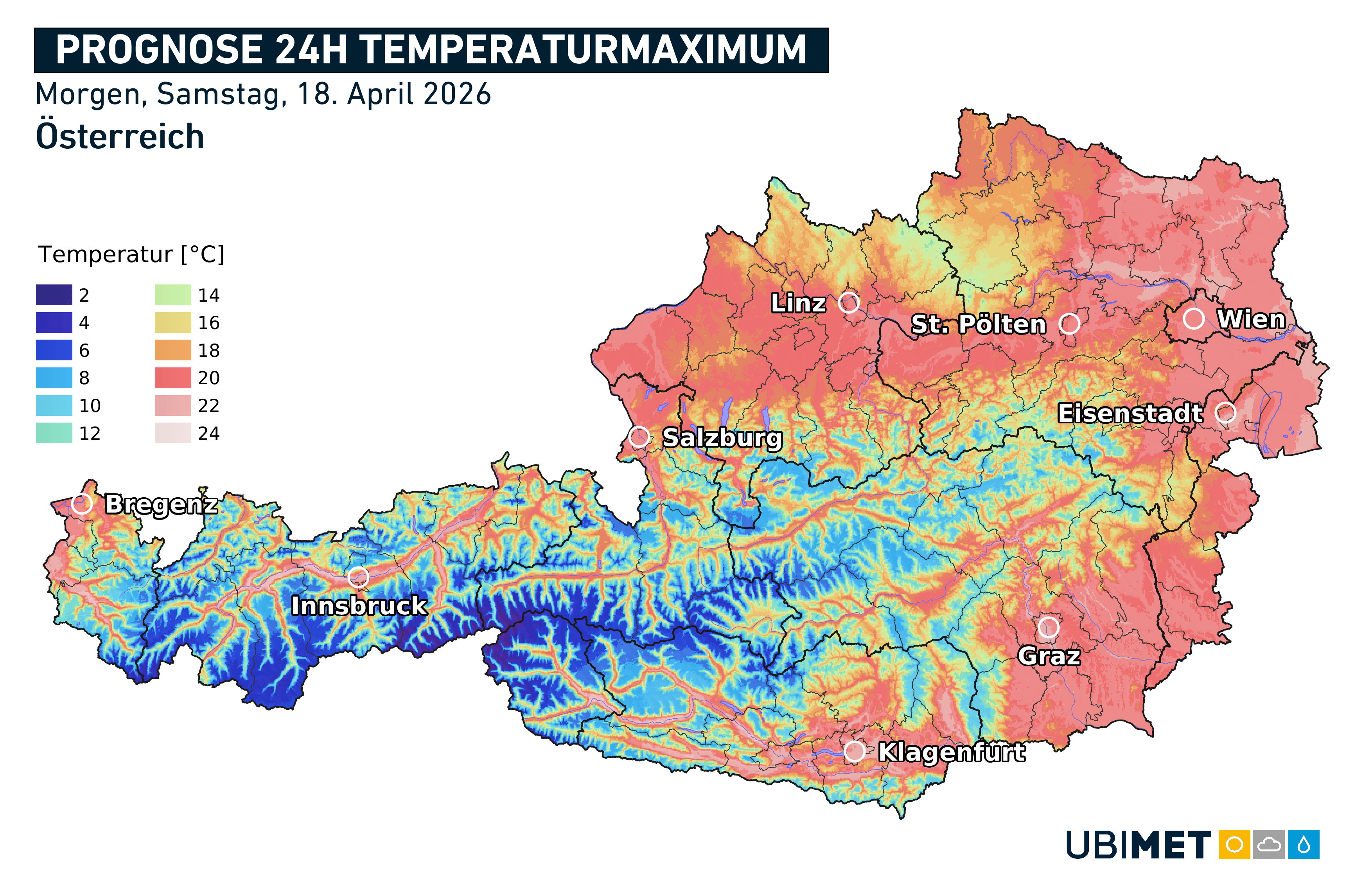 Am Samstag scheint häufig die Sonne, lediglich vom Mühl- und Waldviertel bis in die westliche Obersteiermark machen sich anfangs auch etwas mehr Wolken bemerkbar. Im Tagesverlauf bilden sich im Berg- und Hügelland erneut Quellwolken sowie einzelne Schauer. Der Wind weht schwach bis mäßig aus Nord und mit 17 bis 24 Grad bleibt es für die Jahreszeit sehr mild. Im langjährigen Mittel wären im Flachland aktuell Höchstwerte um 17 Grad zu erwarten.